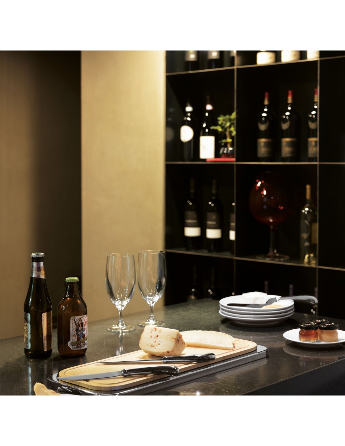 - El cuchillo de lágrima está expresamente dedicado a los quesos duros o curados, como el Grana y el Parmigiano. La hoja corta desprende las escamas, realzando su granularidad.