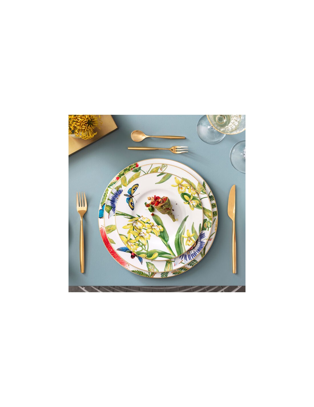 Formas inusuales y decoraciones exóticas ricamente detalladas en colores brillantes hacen que la colección Amazonia Anmut de Villeroy & Boch sea realmente llamativa. Puede servir a sus invitados guisos, sopas o caldos con especial refinamiento en este práctico y creativo plato hondo. Mímate a ti mismo y a los demás con una vajilla de porcelana fina.