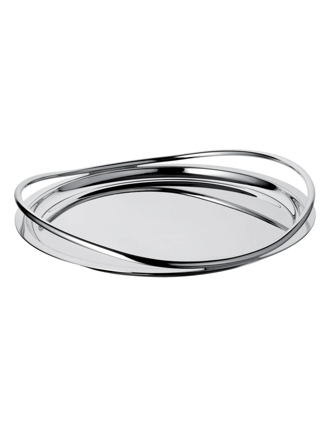 Utilice la gran bandeja redonda plateada para servir comida o exponer sus objetos favoritos. Los anillos calados en relieve hacen las veces de asas. El atrevido motivo de Vértigo, un grueso anillo sutilmente asimétrico colocado a menudo en ángulos divertidos, se encuentra en todas las piezas de la colección diseñada por Andrée Putman.