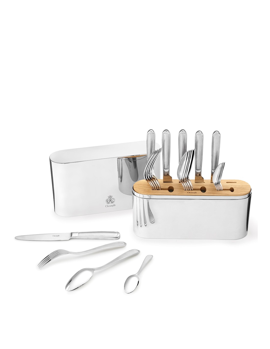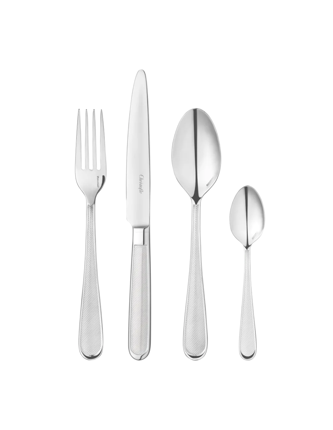 Este juego de 24 piezas de acero inoxidable contiene cubiertos esenciales para 6 personas, incluidos 6 tenedores de mesa, 6 cuchillos de mesa, 6 cucharas de mesa y 6 cucharas de café. Un estuche de acero inoxidable pulido a espejo con disco interior de madera de roble blanco guarda los cubiertos. Tenga en cuenta que el estuche y los cubiertos se embalan por separado para evitar que se rayen durante el envío. Christofle presenta un nuevo juego inspirado en la forma oblonga de la parisina Place de la Concorde. Concorde combina belleza y comodidad.