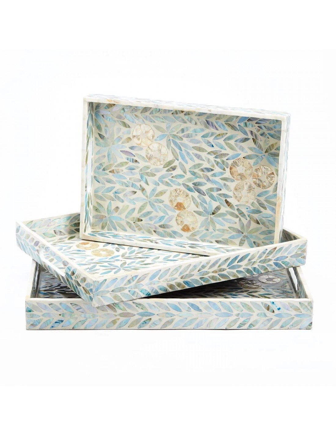 Este impresionante juego de bandejas, que recuerda a una pintura de acuarela, demuestra que el arte no tiene por qué colgarse de la pared. Elaborados con nácar, los diseños presentan elegantes ilustraciones de flores de Palawan.