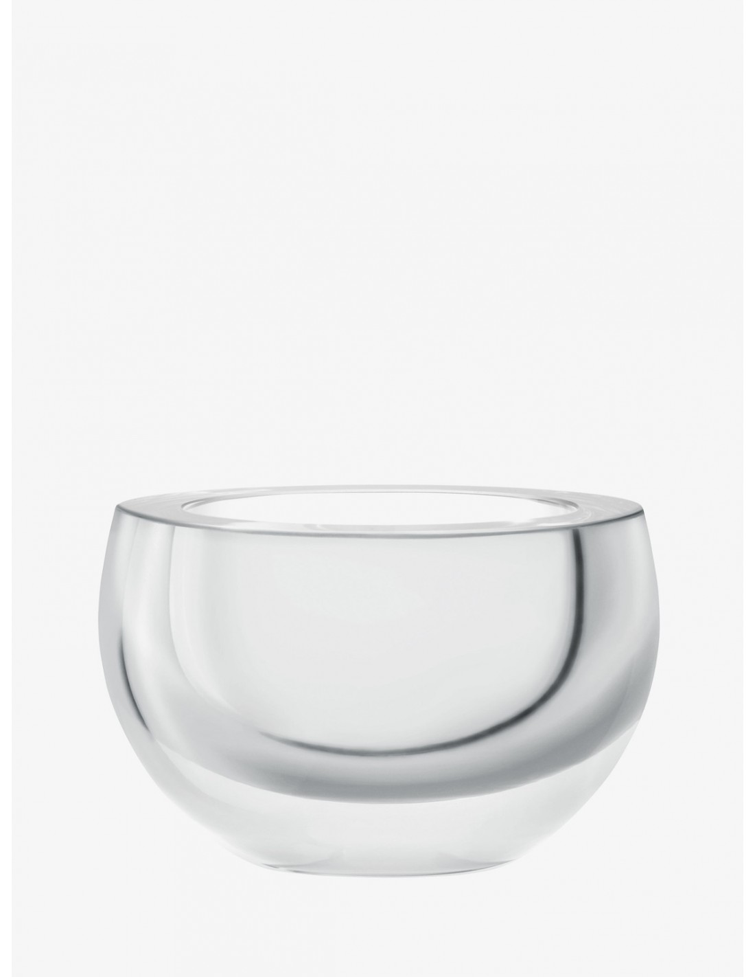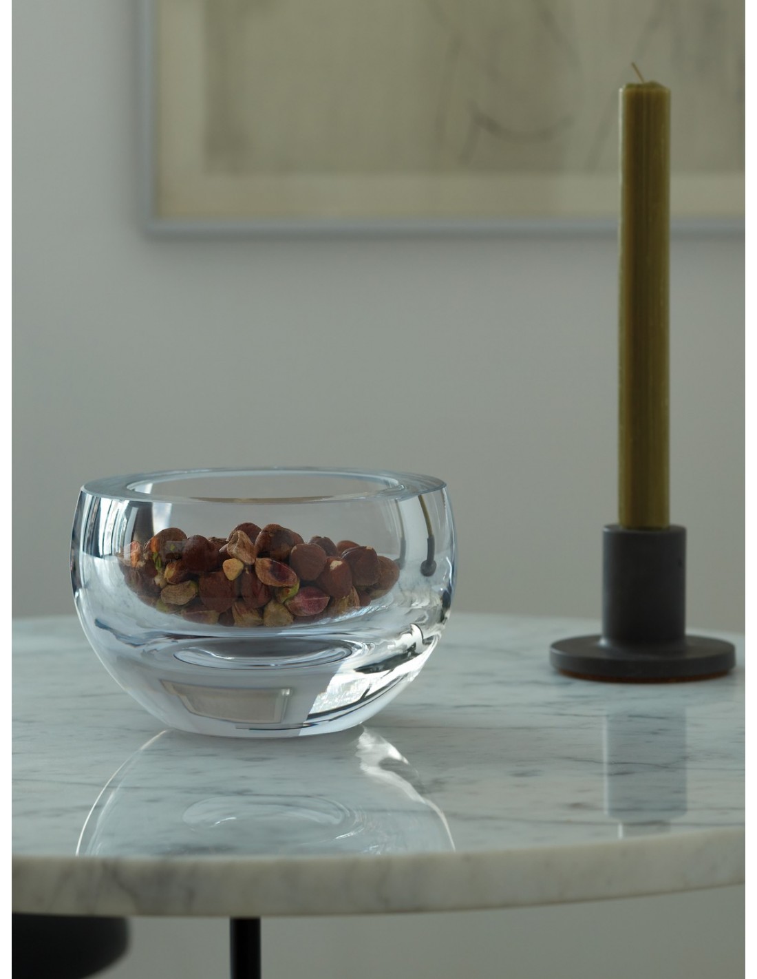 Un cuenco decorativo con paredes curvas y borde pulido, soplado a mano y hecho a mano por maestros vidrieros.