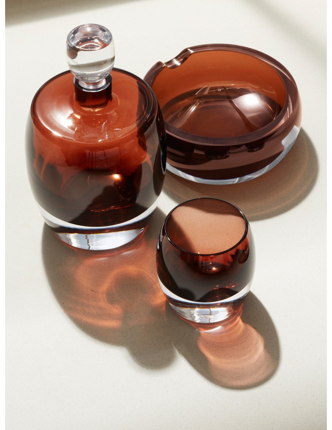 Un cenicero para cigarros, soplado con la boca por maestros sopladores de vidrio a partir de capas de vidrio transparente y marrón.