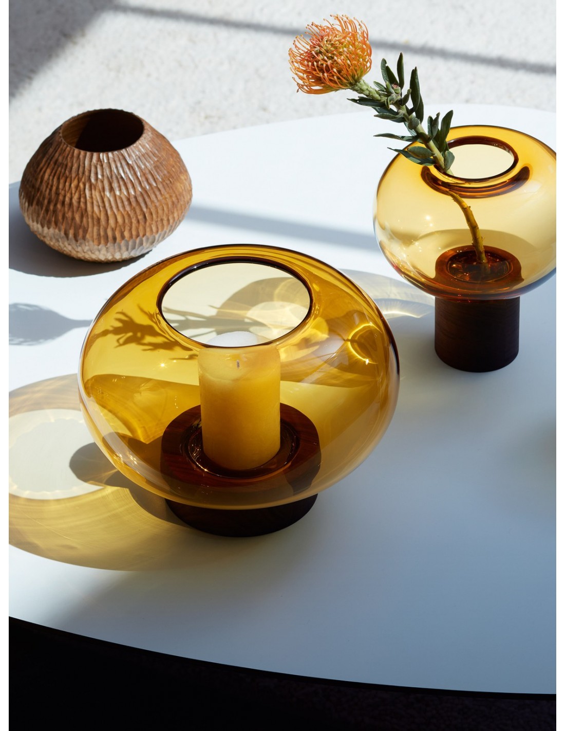 Vasija esférica aplastada elevada sobre una base de nogal.