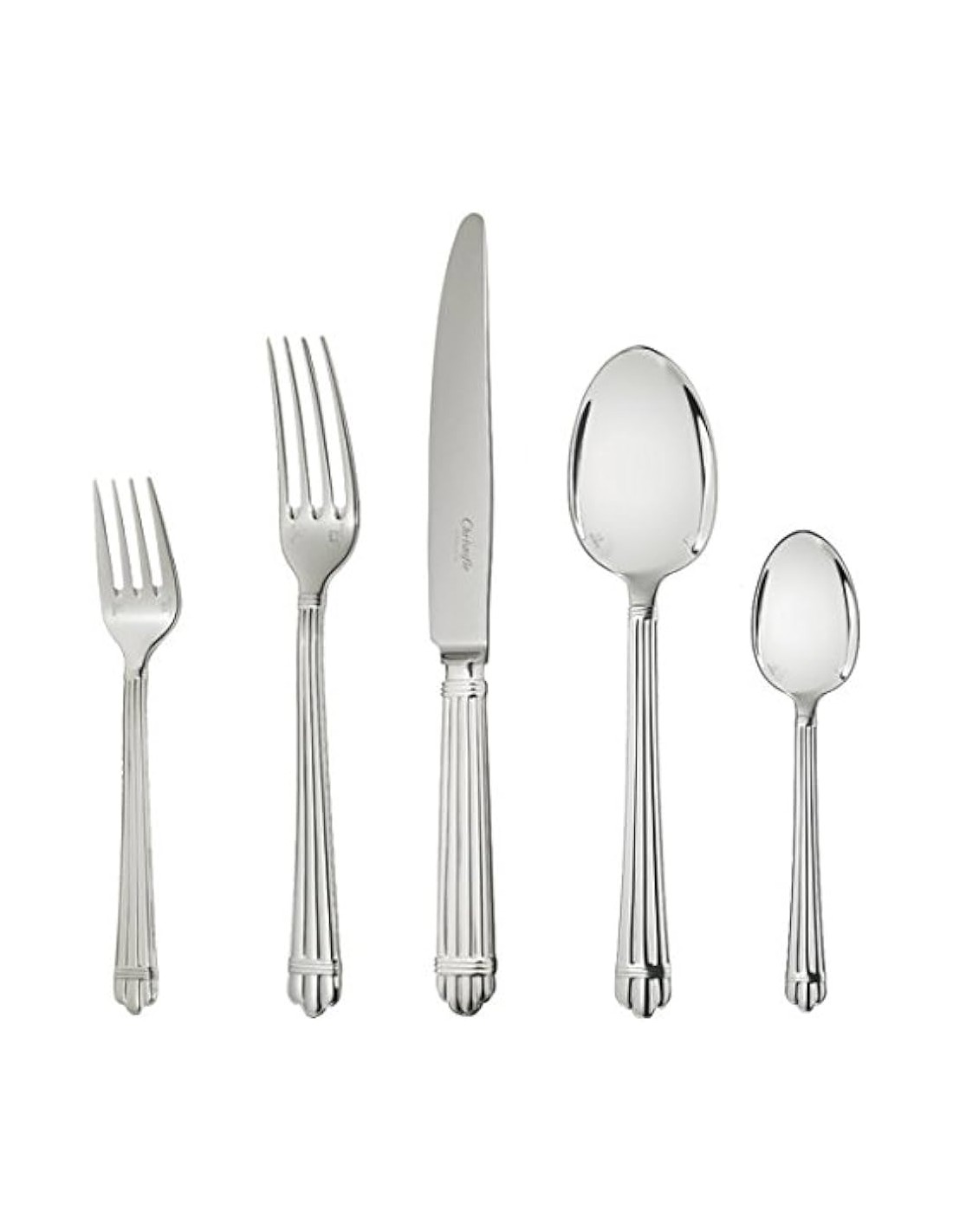 El cubierto de cinco piezas plateado para una persona con el patrón Aria contiene uno de cada uno de los siguientes utensilios esenciales: un tenedor, un cuchillo, un tenedor para ensalada, una cucharada estándar y una cucharadita. Tenga en cuenta que los cubiertos que se presentan en la imagen pueden diferir de los cubiertos que realmente recibe. Te sugerimos contactar con atención al cliente para confirmar las piezas incluidas en el set que te interesa.