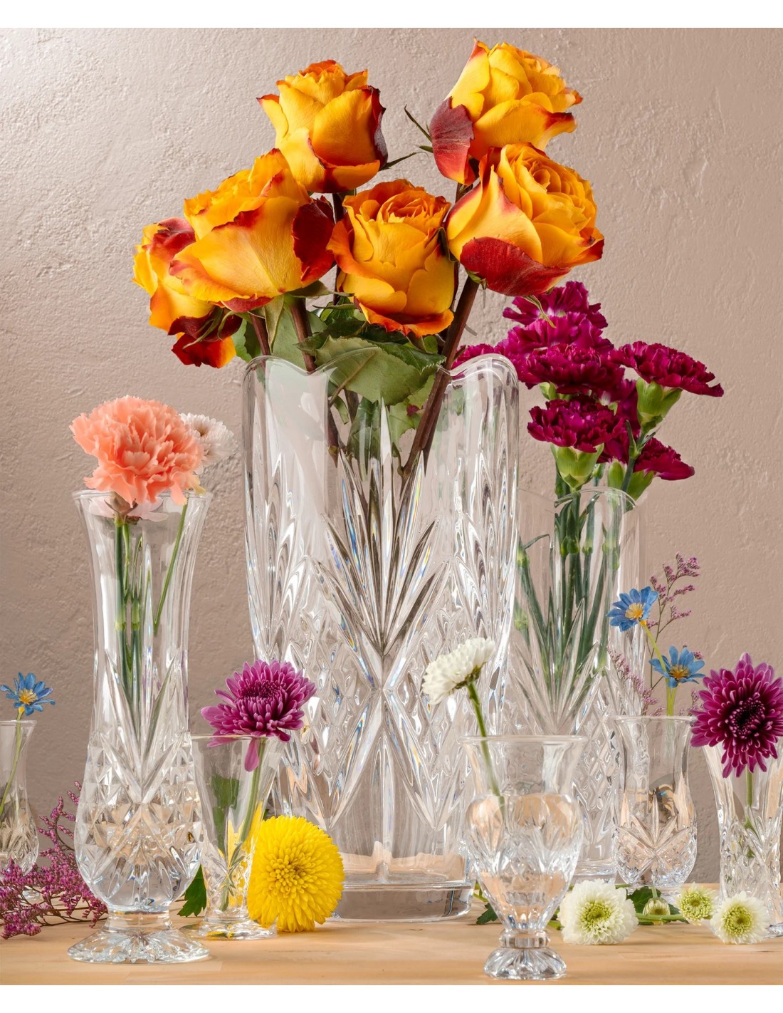 Nuestra colección Dublin rinde homenaje al arte tradicional de la cristalería tallada, evocando gracia con su patrón de talla brillante y su diseño atemporal. Este juego de jarrones de cinco piezas es elegante y realza cualquier hogar con su toque sofisticado.