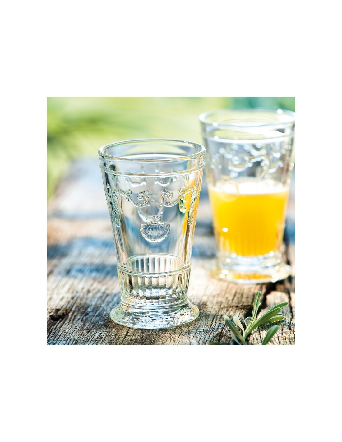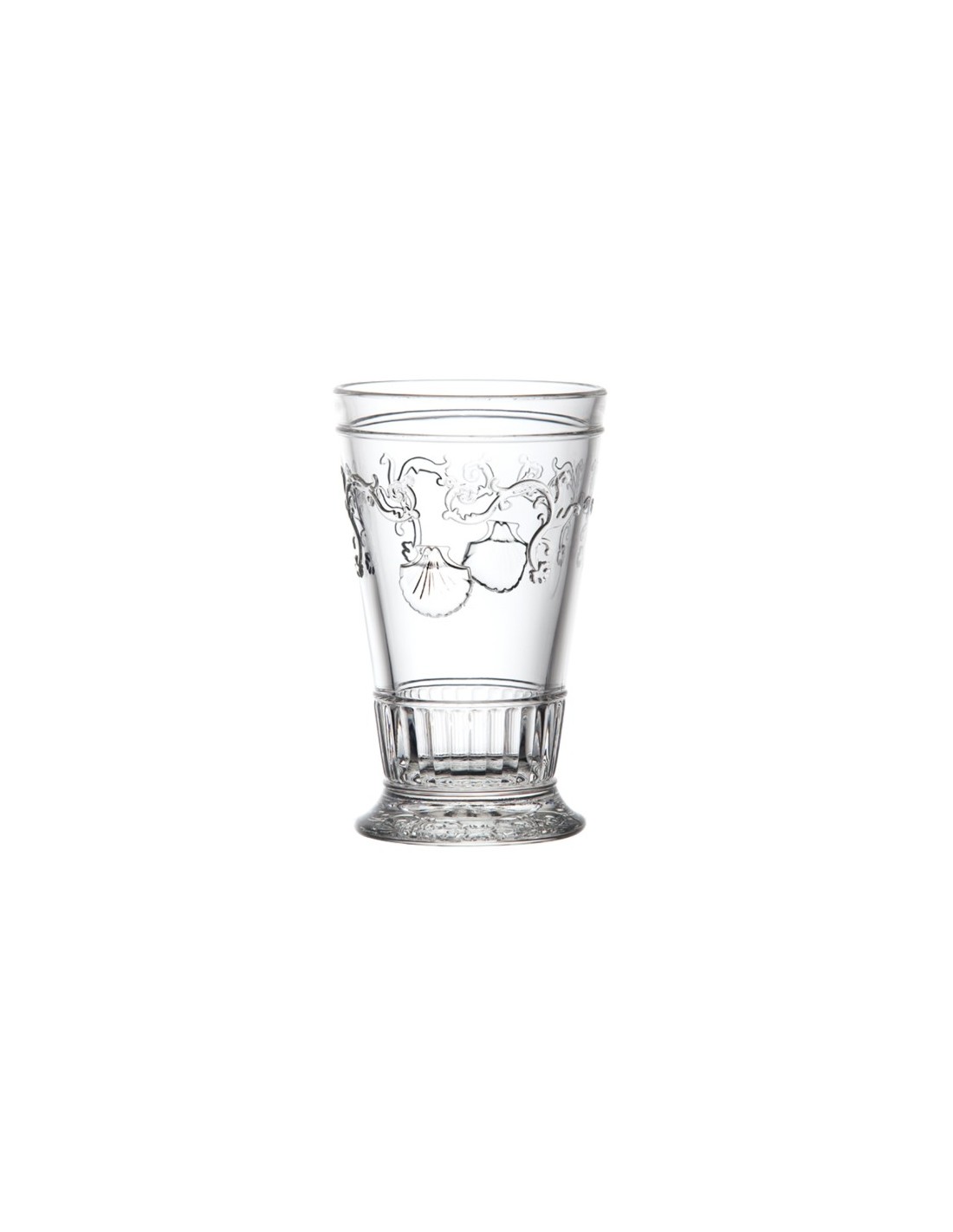 Vaso trago largo elaborado en vidrio prensado. Los lados están decorados con un motivo barroco en relieve de volutas, flores y vieiras.
