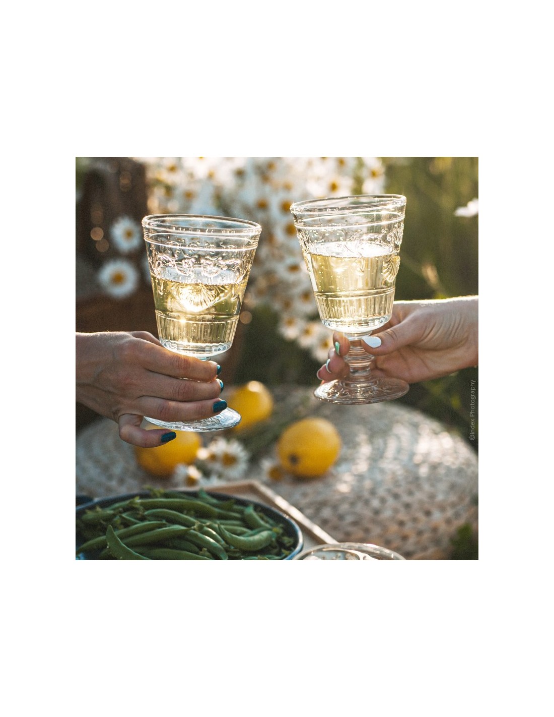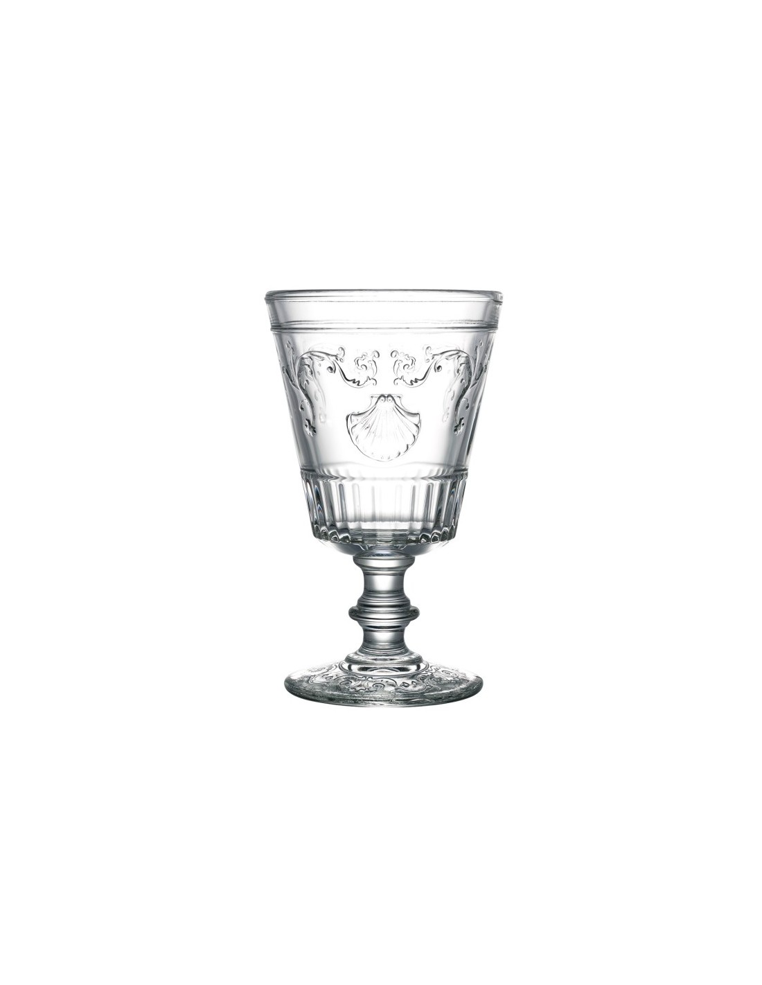 Copa de degustación de vidrio prensado, pie de botón, decorada con motivos barrocos en relieve de volutas, flores y vieiras.