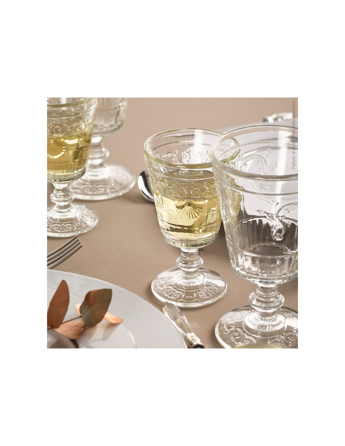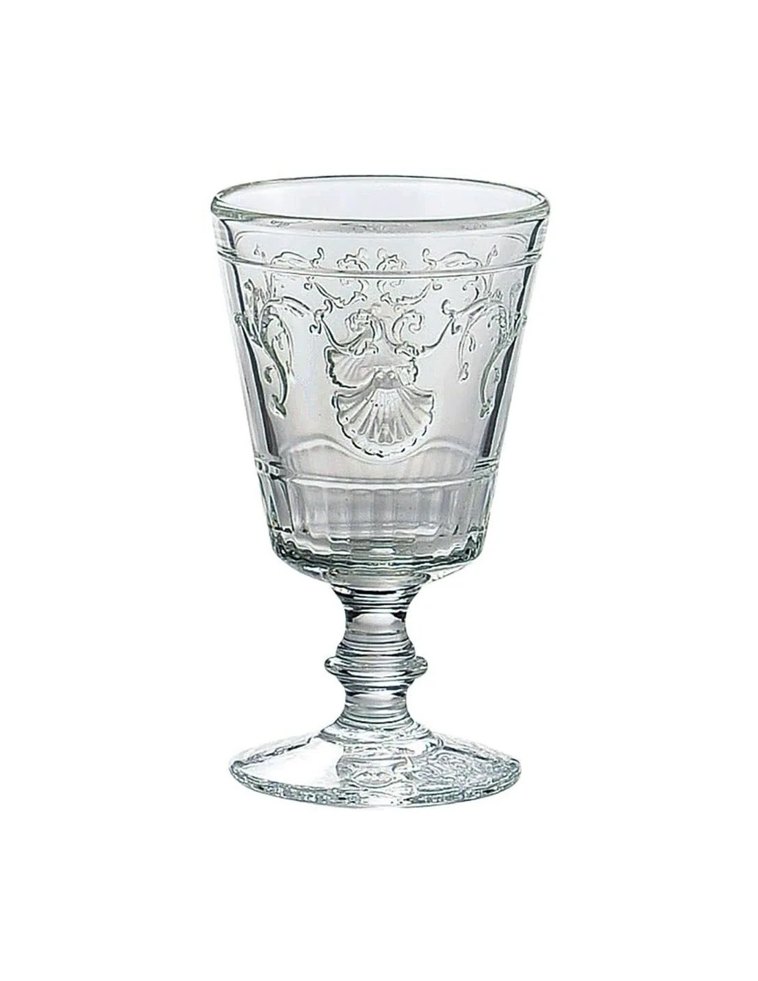 Estas exquisitas copas de vino están adornadas con un intrincado motivo de concha y flor y una base facetada que capta y refleja la luz. Su silueta cuadrada está inspirada en los diseños icónicos de cristalería del palacio de Versalles.