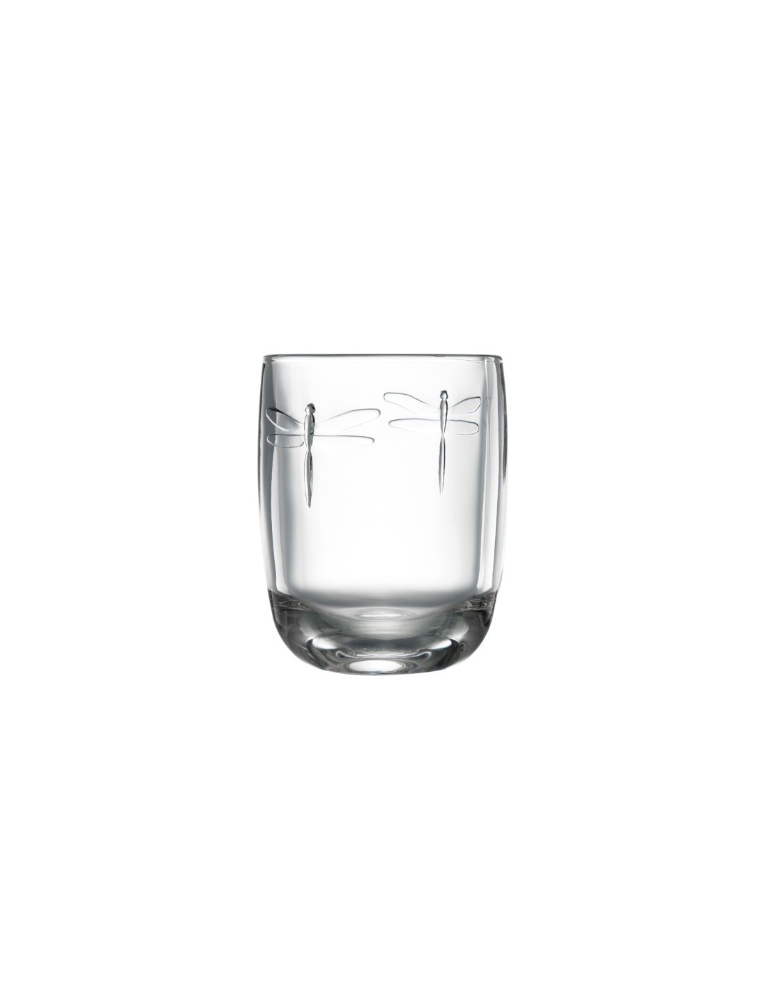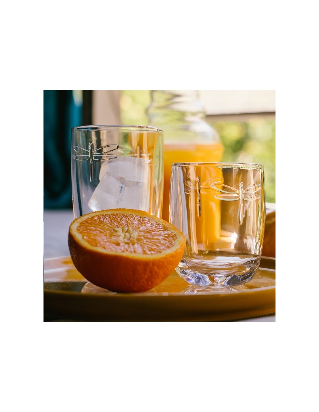 Vaso fabricado en vidrio prensado, decorado con 2 libélulas en relieve, para mesa de estilo rústico.