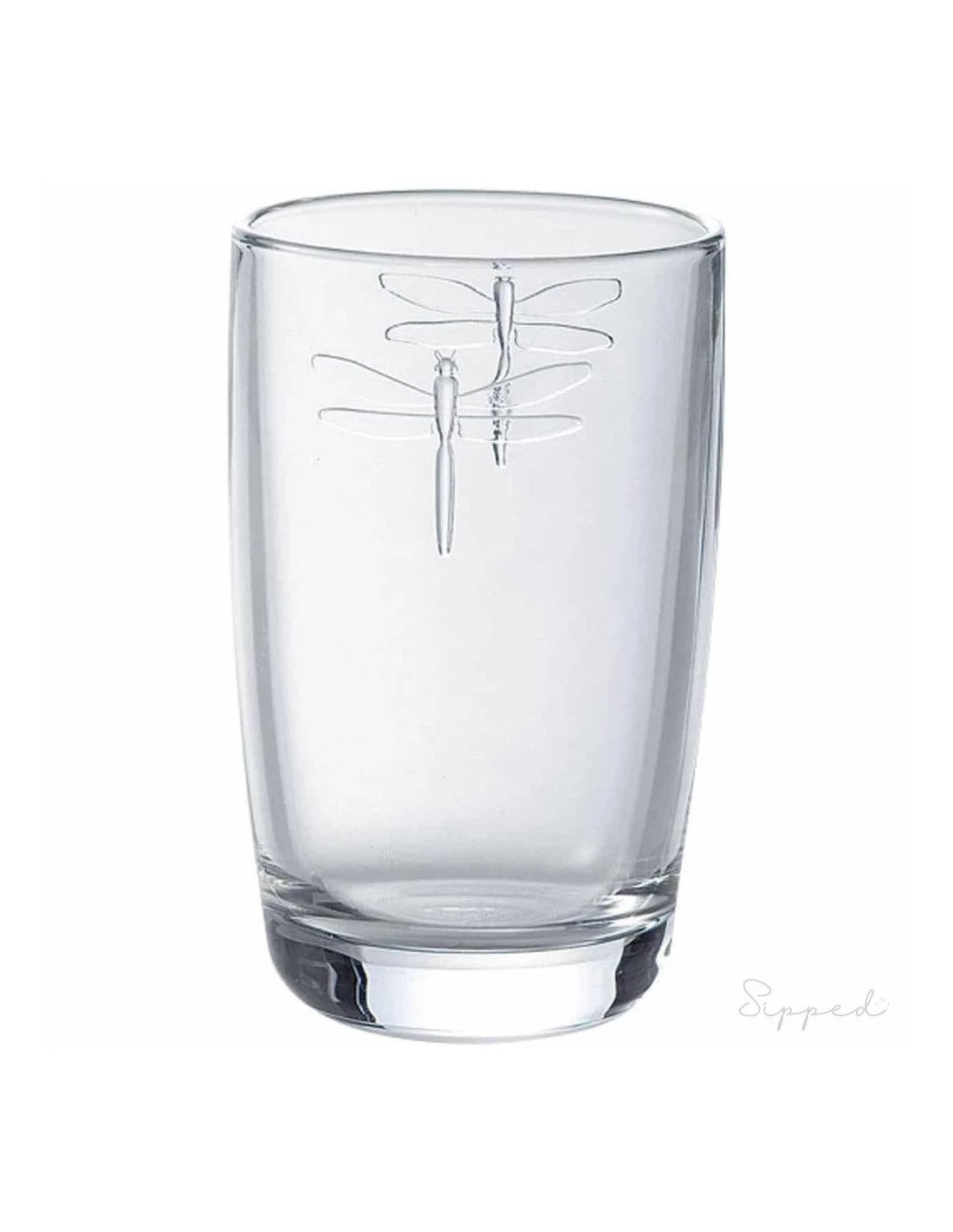 Líneas limpias, libélulas danzantes y una base perfectamente ponderada le dan a este vaso de jugo un encanto irresistible. Este es el vaso ideal para todos los días con un alegre estilo francés.