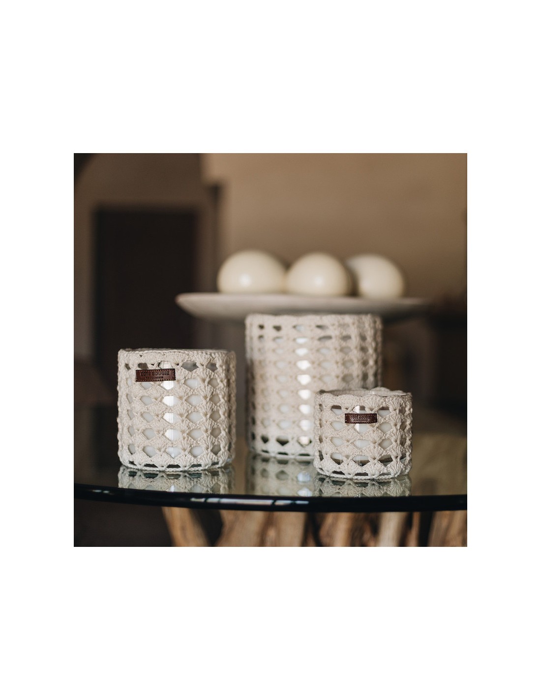 Una fragancia de higo en un frasco de vidrio cubierto de sublime macramé blanco. Una fragancia y un diseño únicos para añadir un toque bohemio a tu interior.