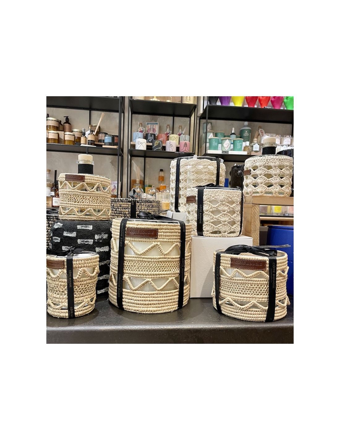 Un difusor con bastones de perfume a la figura, en un frasco en una elegante decoración de macramé.