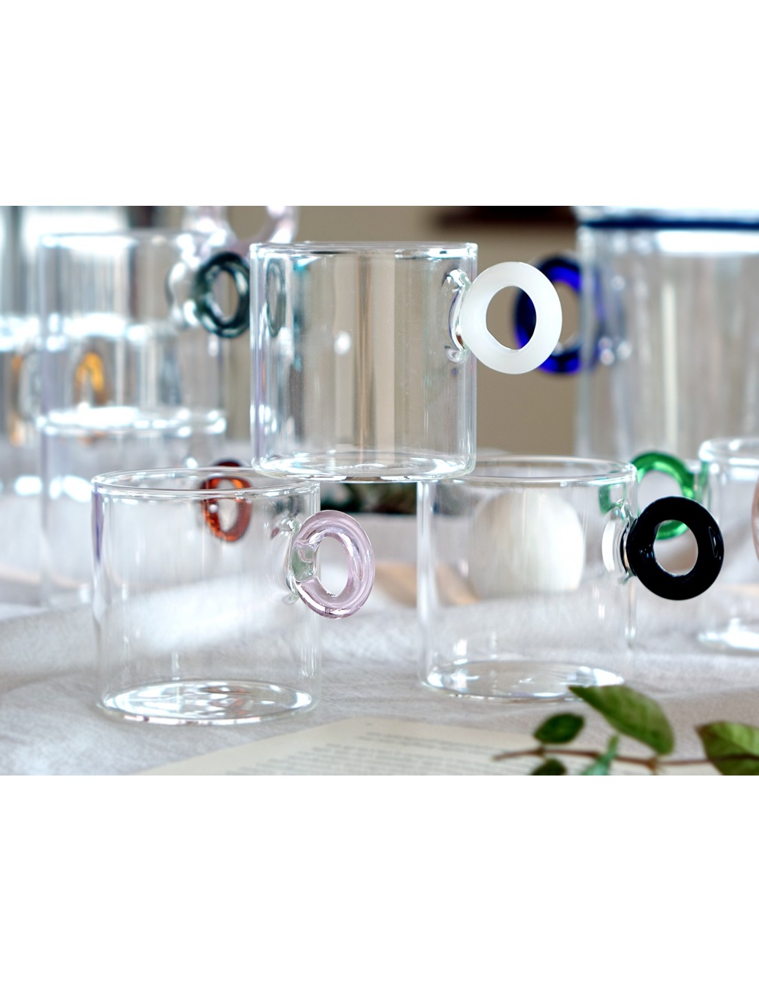 Juego de 6 tazas de café de vidrio borosilicato con asa aro de color. Un surtido apto para cada ocasión que dará color y singularidad a tu mesa. Capacidad 100ml. Mango de color.