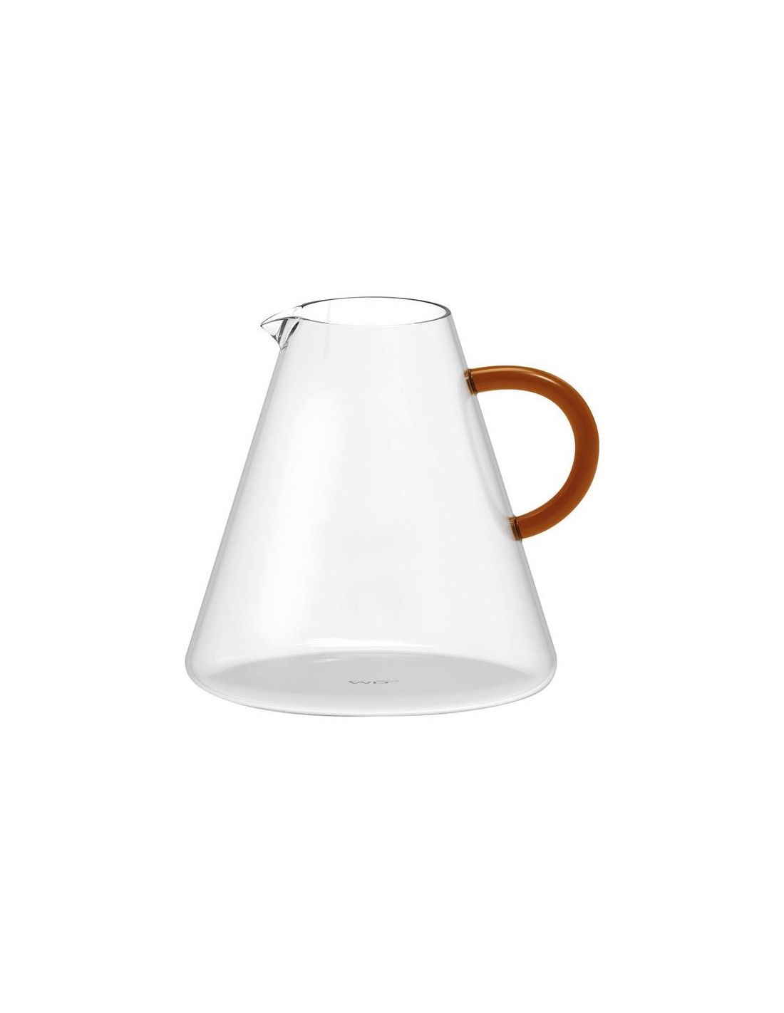 Jarra de cristal de borosilicato con asa de color. Su forma moderna hace que esta jarra sea única y original. Capacidad: 1,6L.