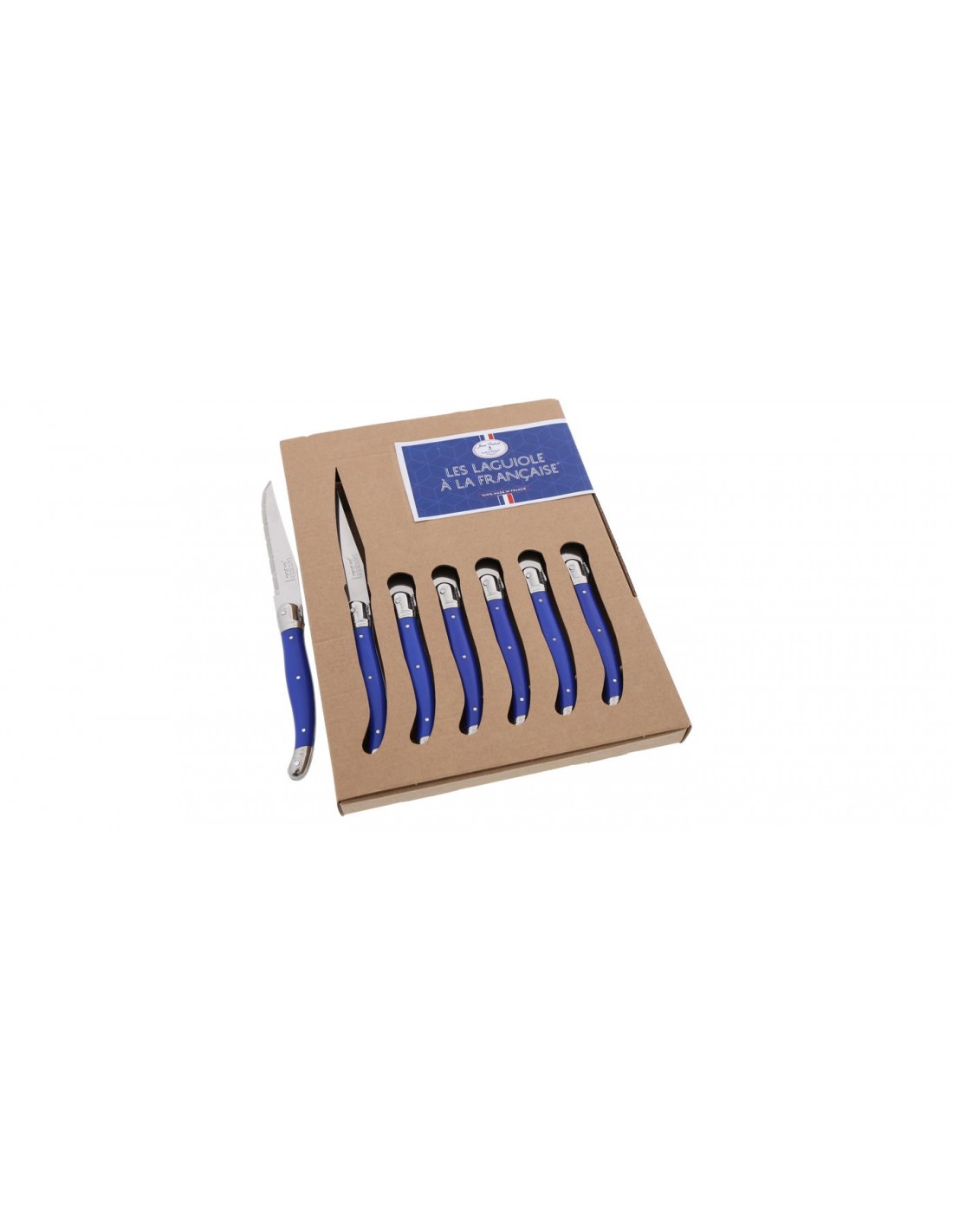 Este juego de 6 cuchillos para carne de calidad "premium" se fabrica en la centenaria empresa familiar francesa Jean Dubost. Estos cuchillos afilados, elegantes y macizos se adaptan muy bien a la mano y tienen un grosor de acero de 1,2 mm. El núcleo interior del mango está hecho de un plástico (ABS) resistente y duradero. La carcasa del mango es de acero. La hoja del cuchillo para carne de acero inoxidable tiene un afilado suave y es excelente para cortar filetes, cordero, platos a la parrilla, caza y rollitos.