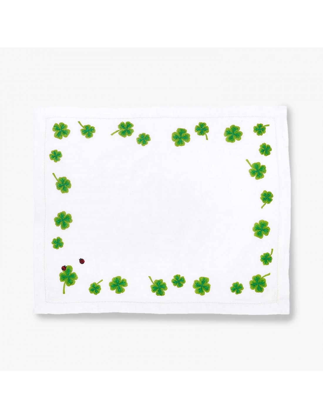 Un refinado mantel individual de lino, decorado con tréboles de la suerte y adorables mariquitas bordados a mano.