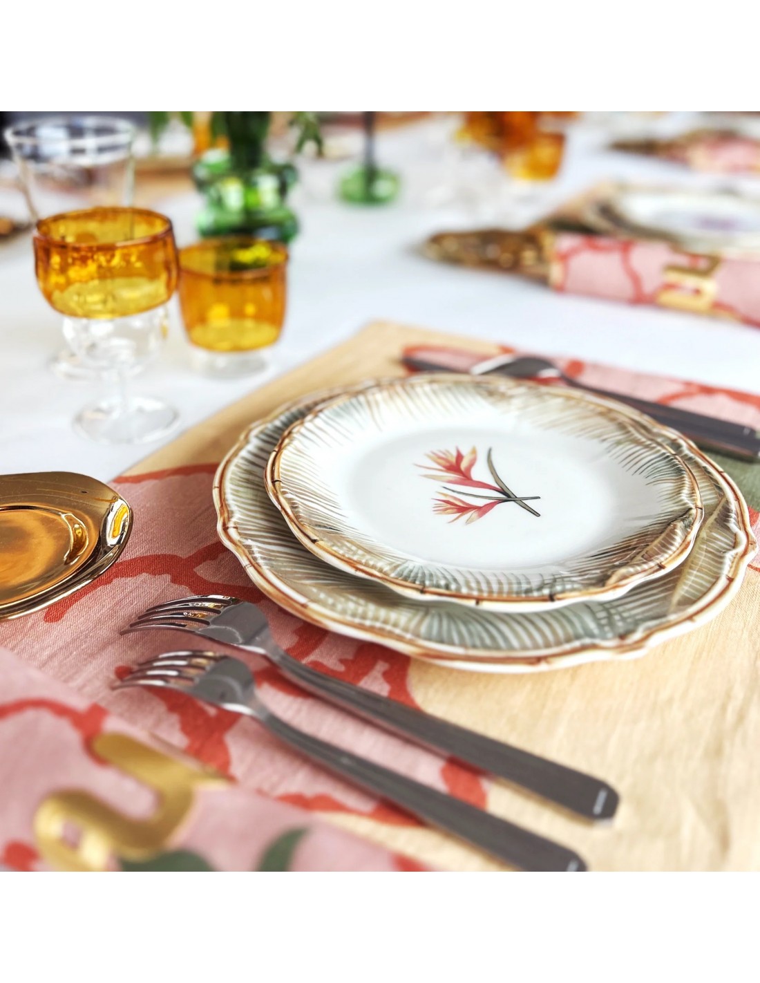 Waww La Table lanza esta colección con un encanto increíble, un toque vintage sin dejar de ser atemporal y elegante. Te llevamos a un viaje en el tiempo con un pie en la elegancia y la modernidad gracias a una armonía de colores suaves y armoniosos. Con un toque de encanto de los setenta, esta colección luce increíble con su cautivador patrón de bambú y flores tropicales de color coral.