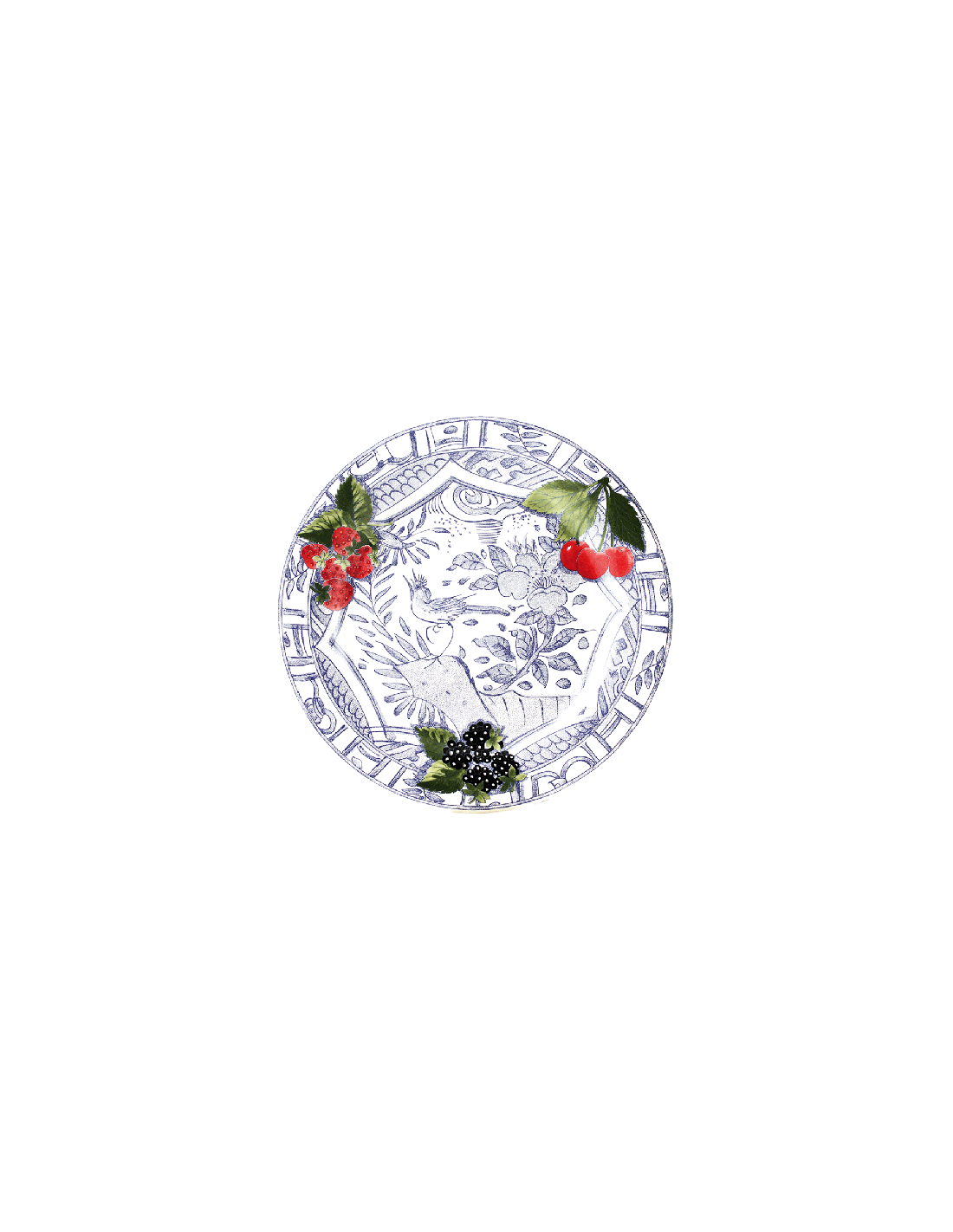Un pájaro cantor, ramas y líneas geométricas son los motivos que forman este sutil diseño azul donde suculentas frutas se depositan delicadamente sobre la loza.
