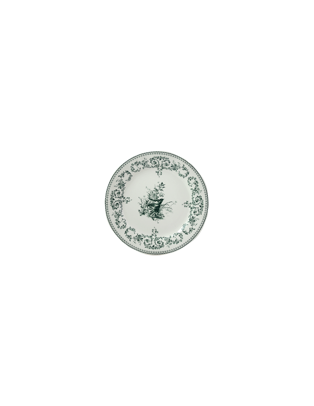 Caja de 4 platos de postre Oiseau de la colección Les Dépareillées Vert. Estos platos elegantes y atemporales proceden de los archivos del siglo XIX y son un auténtico icono de Gien.