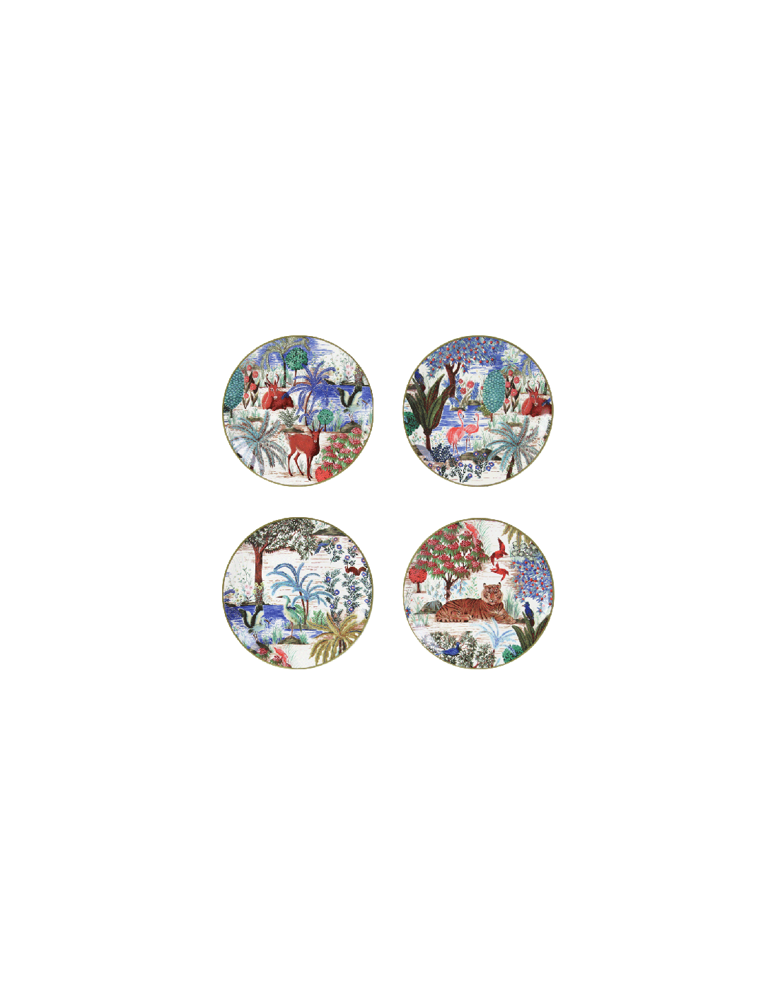 Déjese seducir por los colores vivos y chispeantes, así como por los motivos exóticos de esta bonita caja de 4 platos para canapés Jardin du Palais. Mezcle platos de canapés con platos de postre para obtener una mesa personalizada y que no combine.