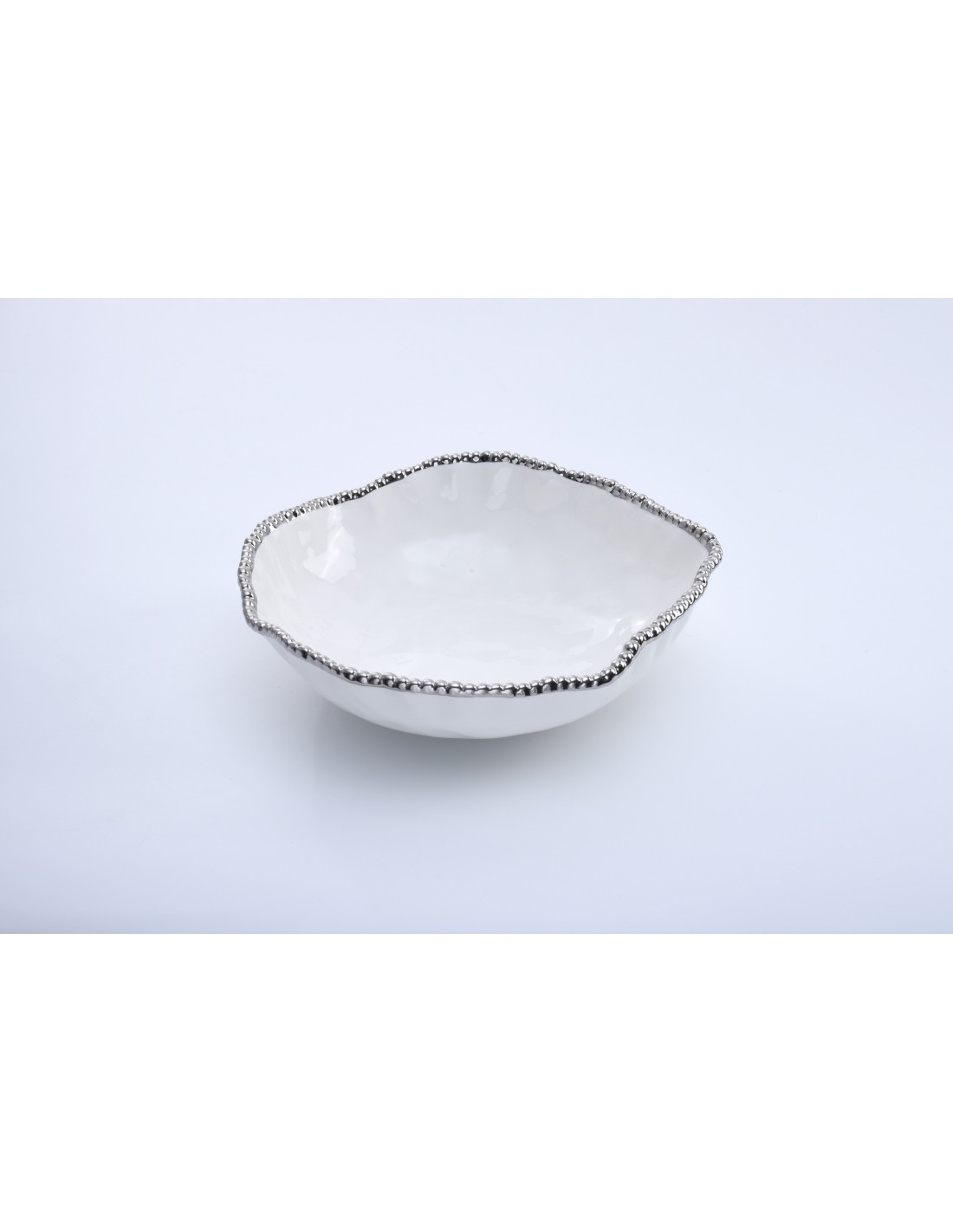 Cuenco para servir de gran tamaño en Salerno. ¡Perfecto para tu próxima cena o vacaciones! Patatas y verduras asadas, espaguetis y albóndigas o una simple ensalada sirven muy bien en este tazón bellamente elaborado. Porcelana blanca reluciente con lustrosas cuentas plateadas en porcelana de alta cocción con acabado de titanio. Alimentos seguros. Aptas para el lavavajillas. Apto para horno a 500°. Cuidado facil.