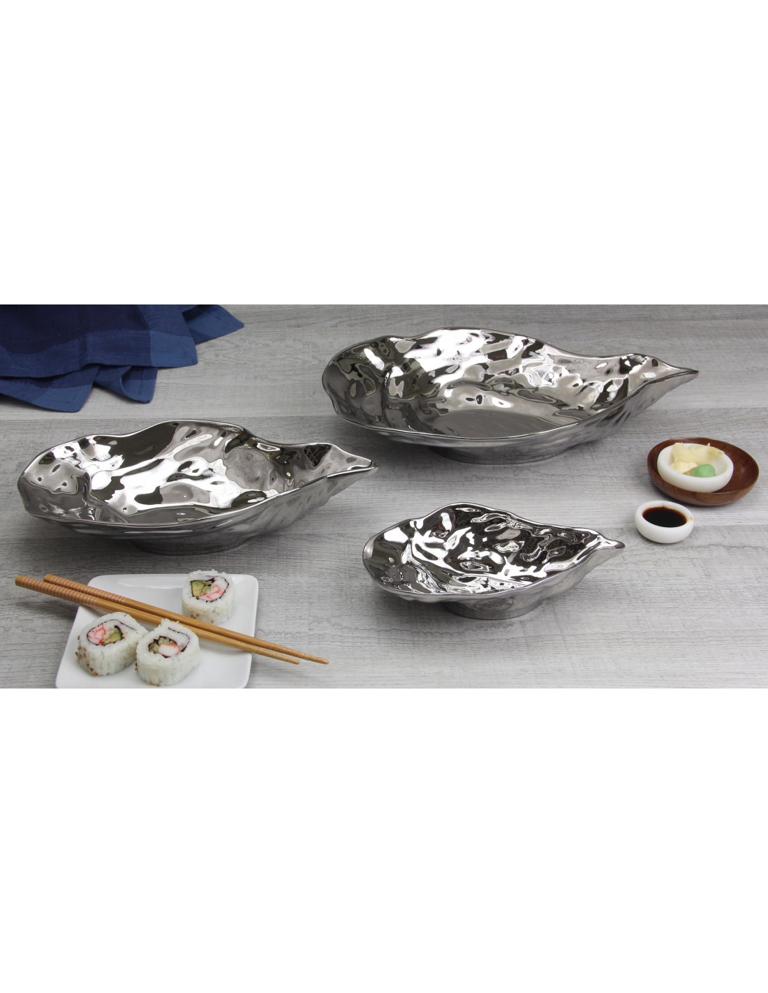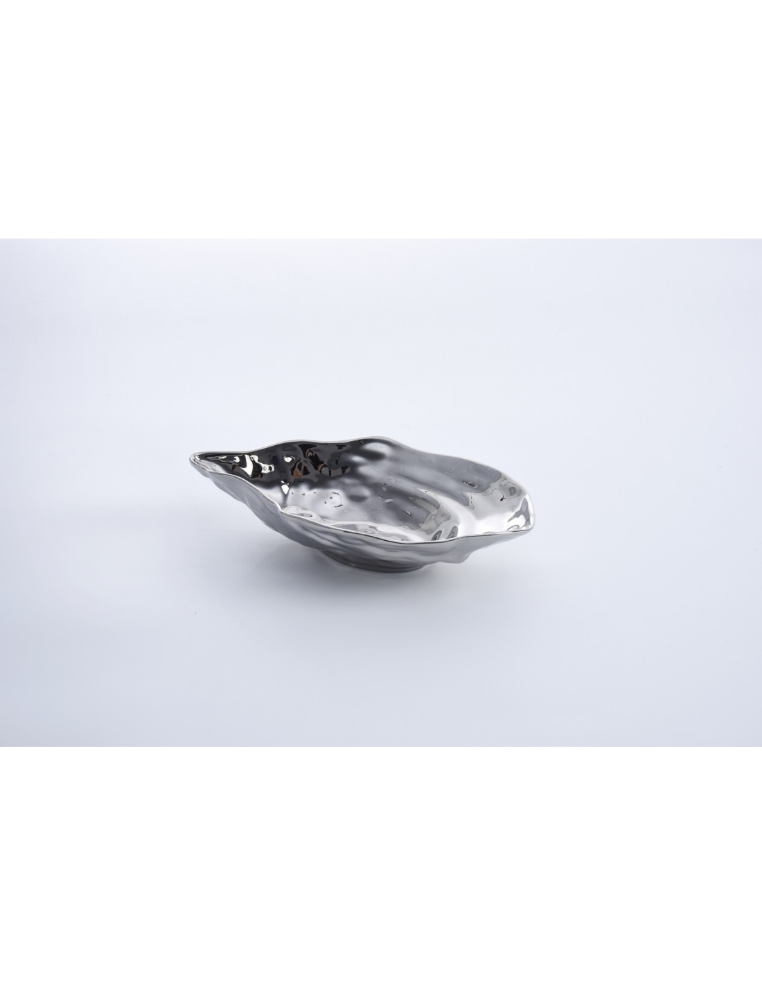 Cuenco mediano de porcelana con forma de ostra recubierto de versátil titanio. La hermosa forma natural de una ostra con un espectacular y atemporal acabado en tono plateado seguramente sorprenderá. Ideal para servir mariscos favoritos como camarones, ensalada de mariscos, vaporeras o mejillones (moules).