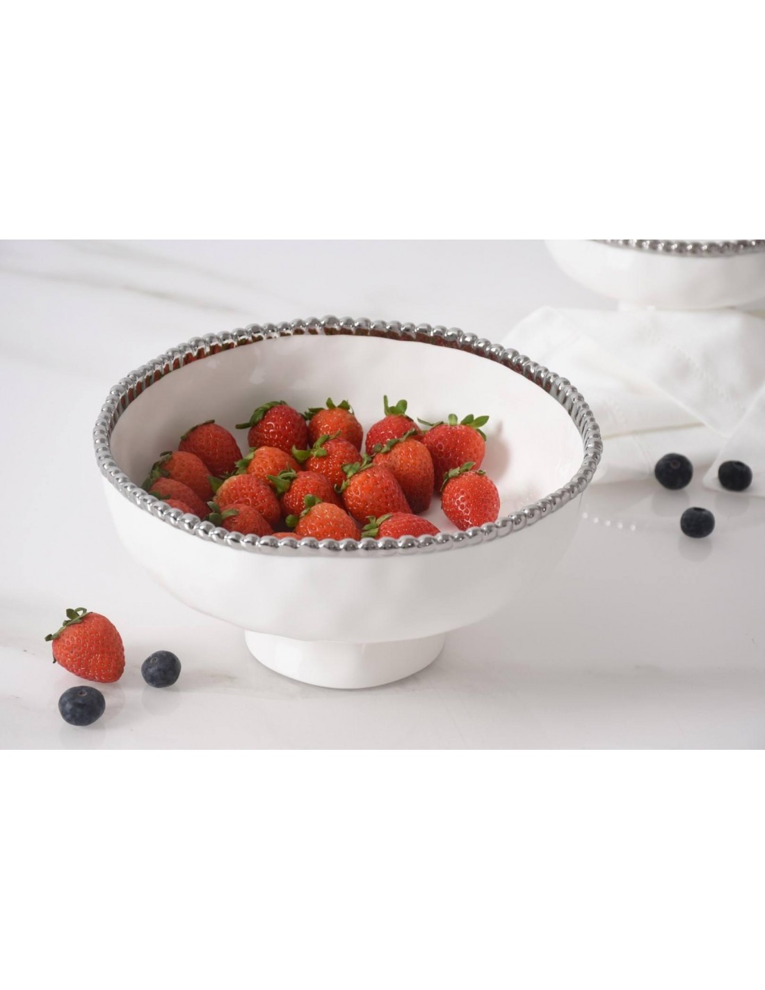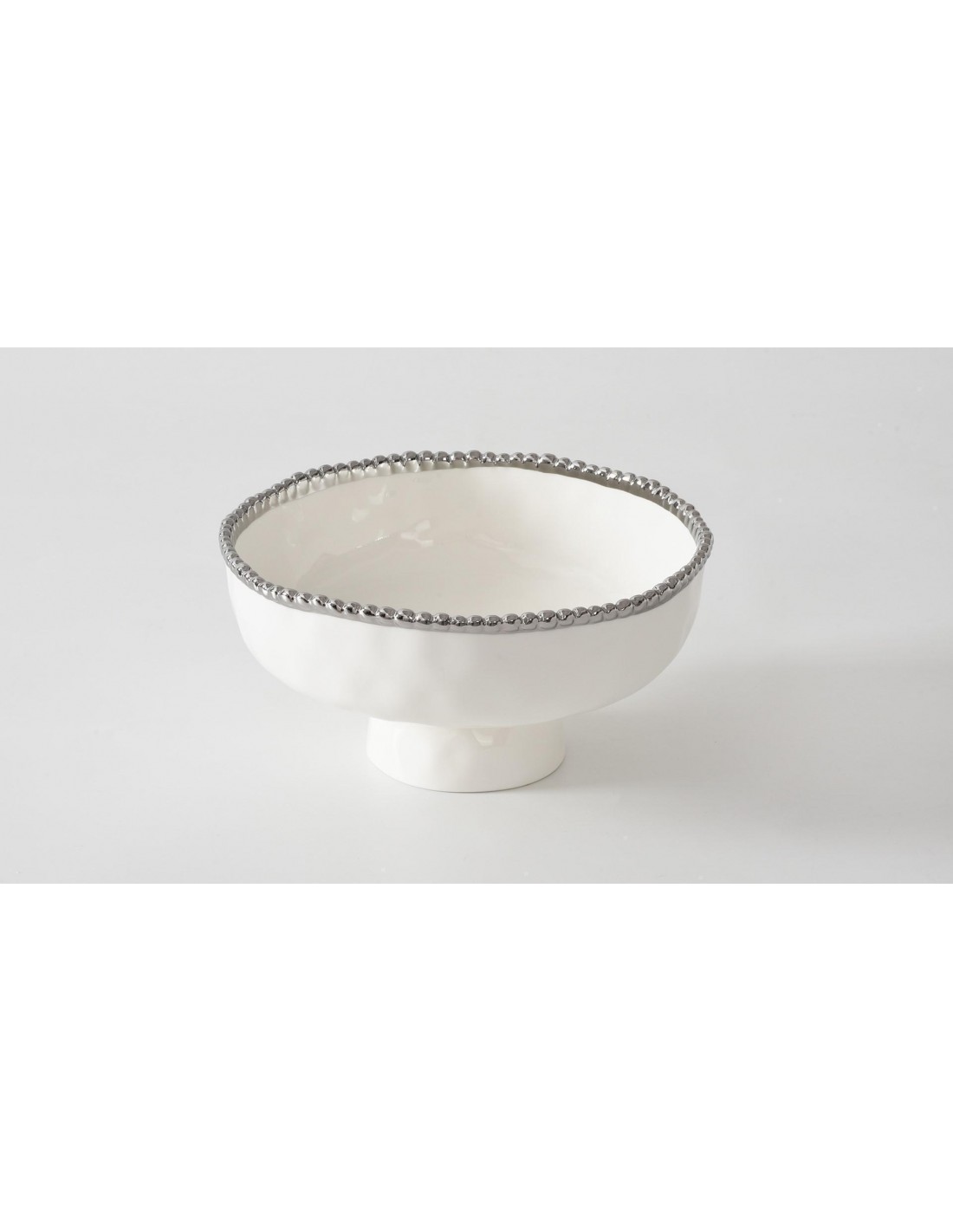 Bowl con pie medium en Salerno. Eleva tu fruta o úsala como pieza central. Llamativas y elegantes cuentas plateadas con porcelana blanca de alta cocción. Alimentos seguros. Aptas para el lavavajillas. Apto para horno a 500°. Cuidado facil.