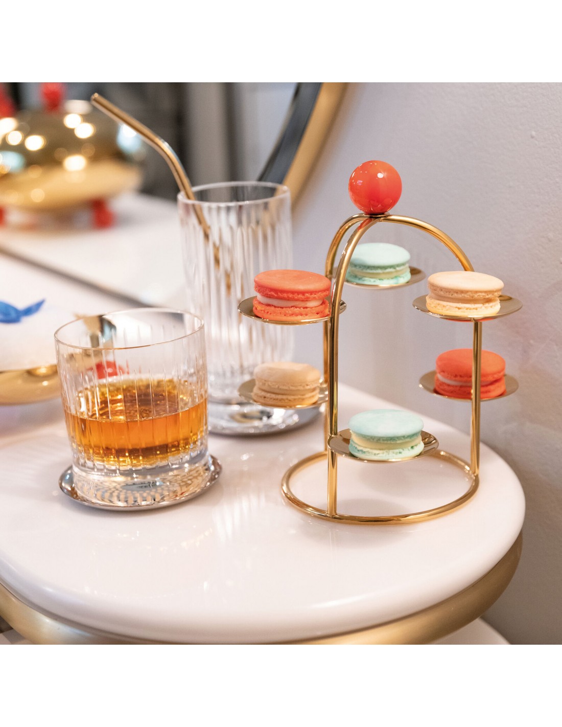 - Un soporte perfecto para exponer macarons, bollería y aperitivos. Un objeto de interiorismo práctico, con un fuerte impacto estético.