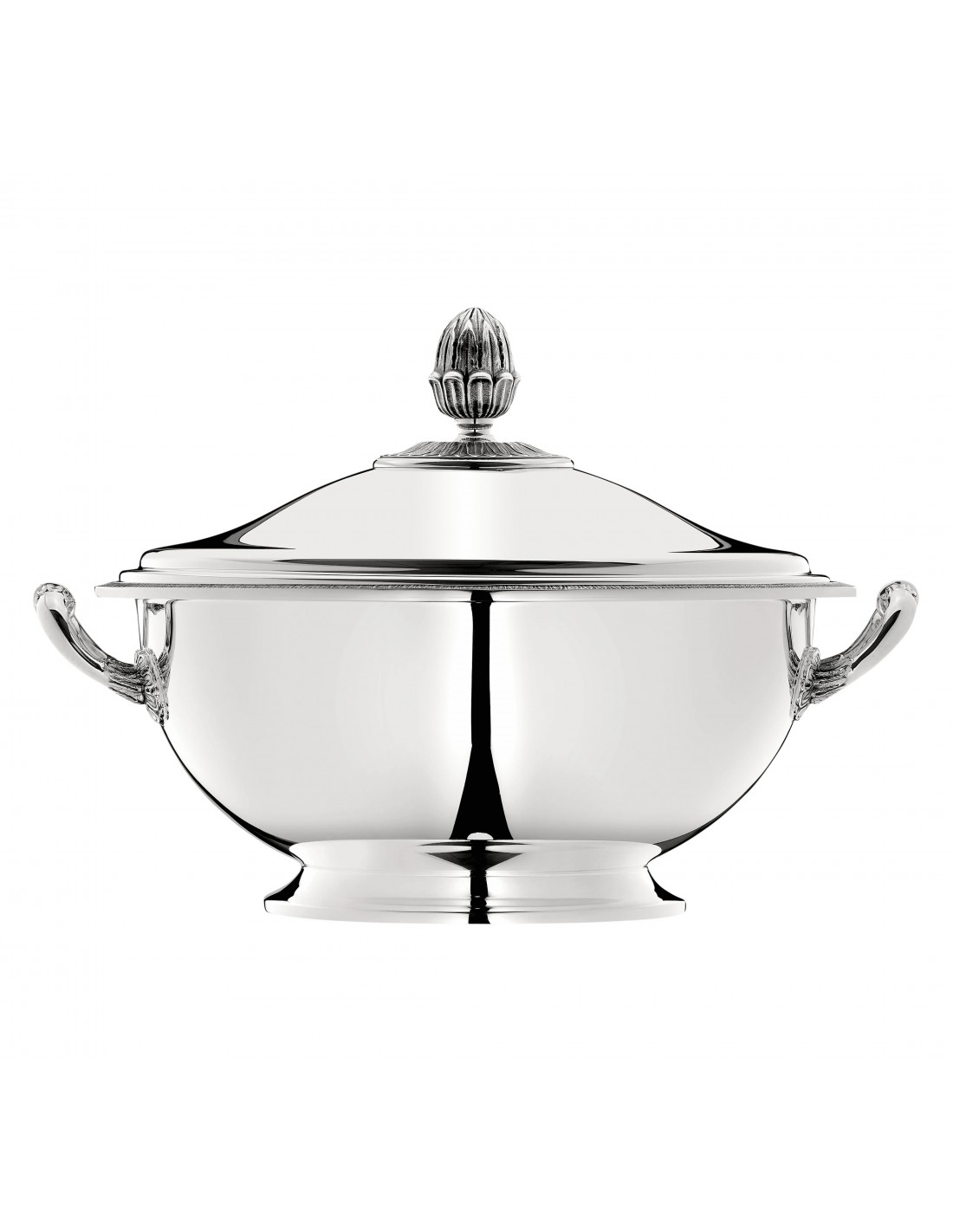 Coloque una mesa elegante con la sopera plateada y con tapa con diseño de Malmaison. Malmaison, uno de los patrones más históricos de Christofle, tipifica el estilo Imperio, con su friso de delicadas hojas de palma y loto y su diseño simétrico. El nombre es un guiño al Chateau de la Malmaison, la residencia parisina favorita de Napoleón Bonaparte y la emperatriz Josefina.