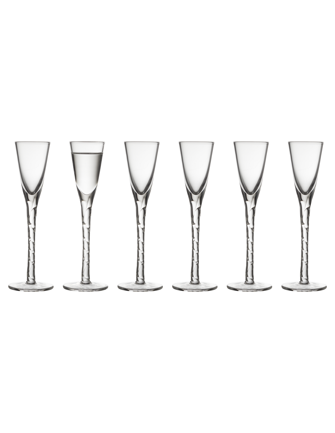 6 vasos de chupito hechos a mano y soplados con tallos retorcidos a mano que contribuyen a crear un buen ambiente en la mesa. Los vasos de aguardiente de cristal transparente tienen un diseño elegante y clásico y tienen una capacidad de 2,5 cl. Alto 16 cm.