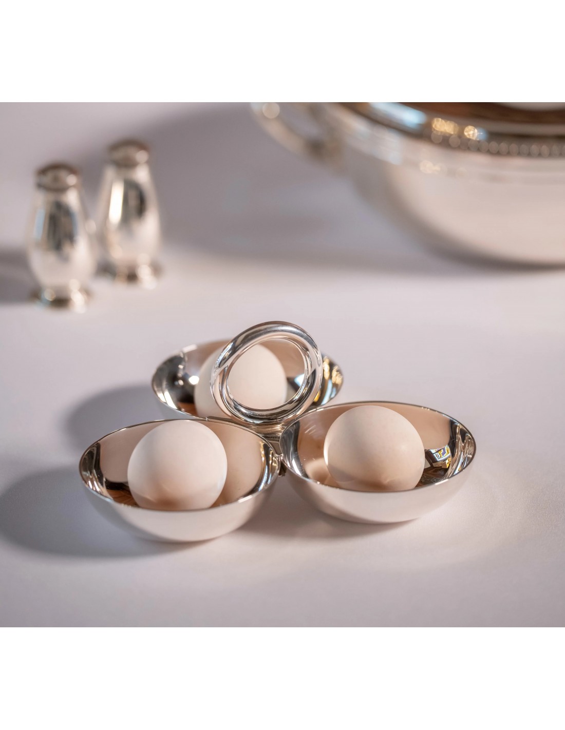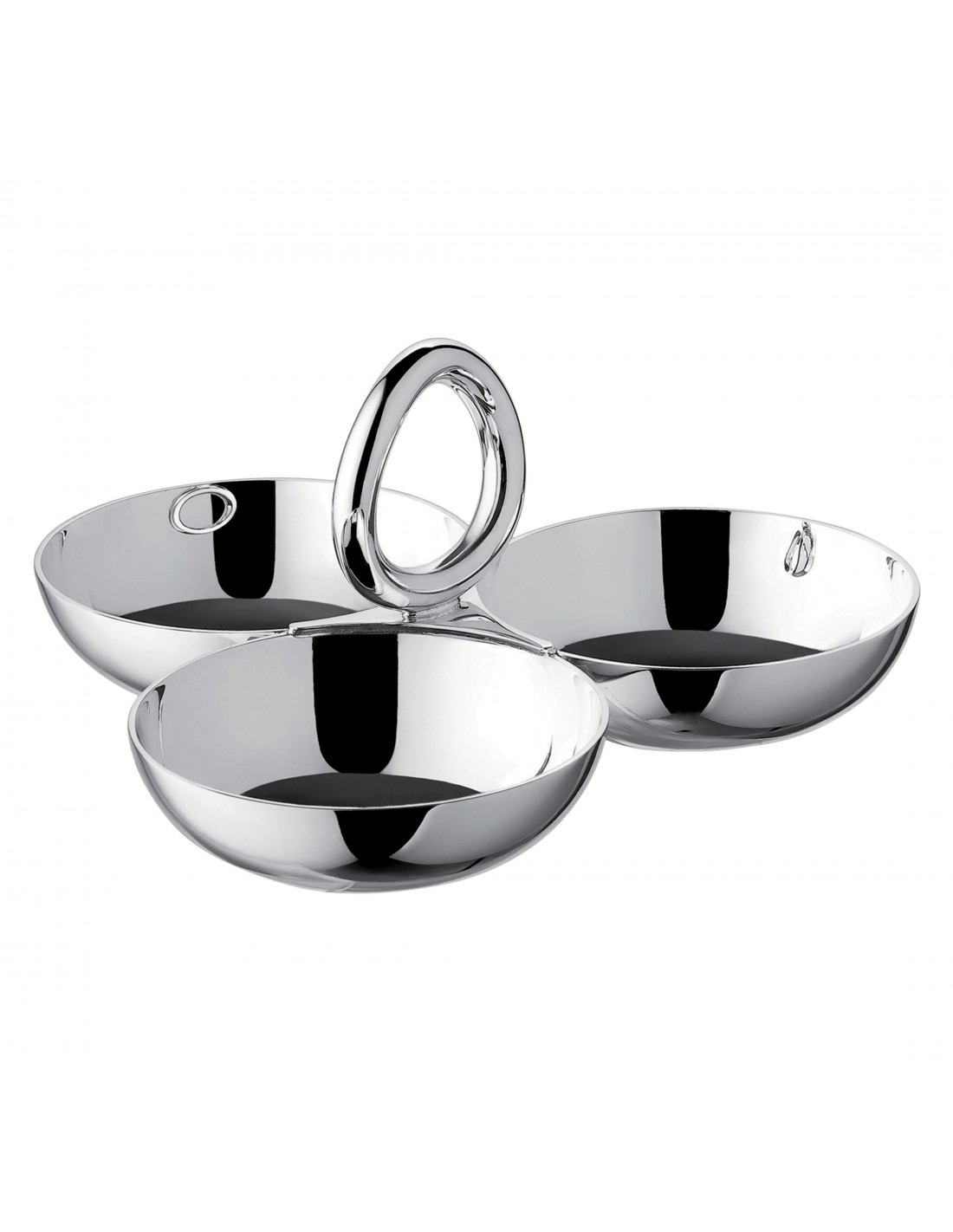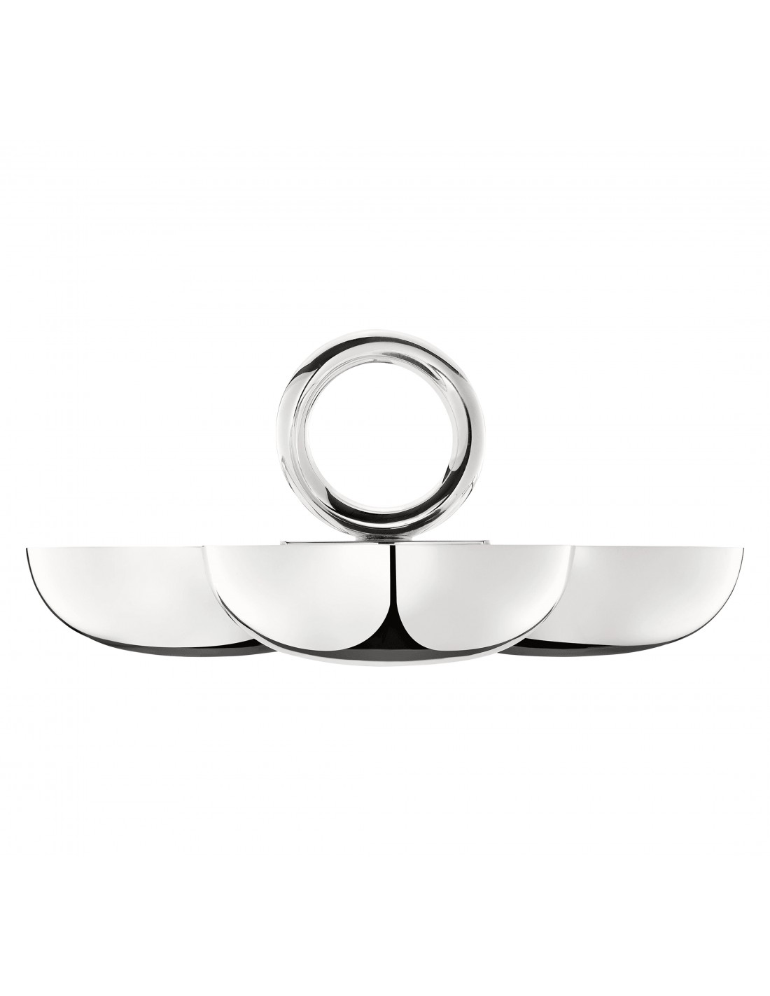 La fuente para servir Vertigo bañada en plata cuenta con tres cuencos pequeños conectados por un asa circular. Esta fuente es perfecta para servir frutos secos, aceitunas y otros aperitivos ligeros. El atrevido motivo de Vertigo, un anillo grueso sutilmente asimétrico colocado de forma divertida, se puede encontrar en todas las piezas de la colección diseñada por Andrée Putman.