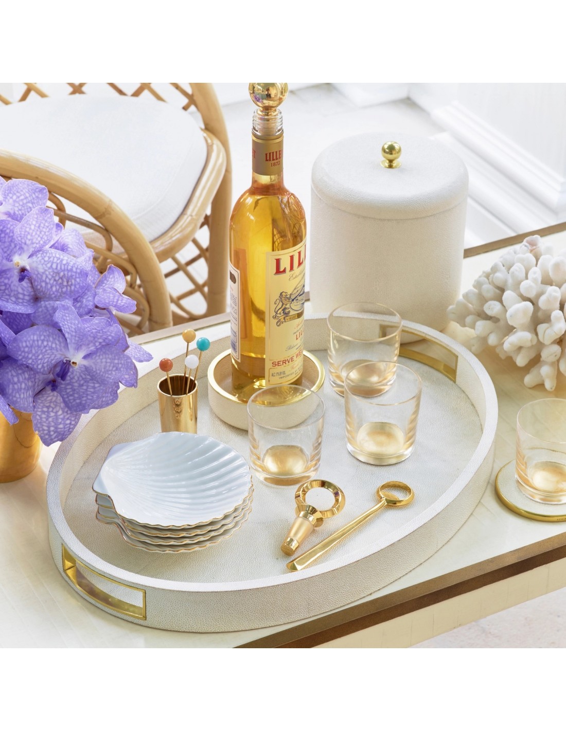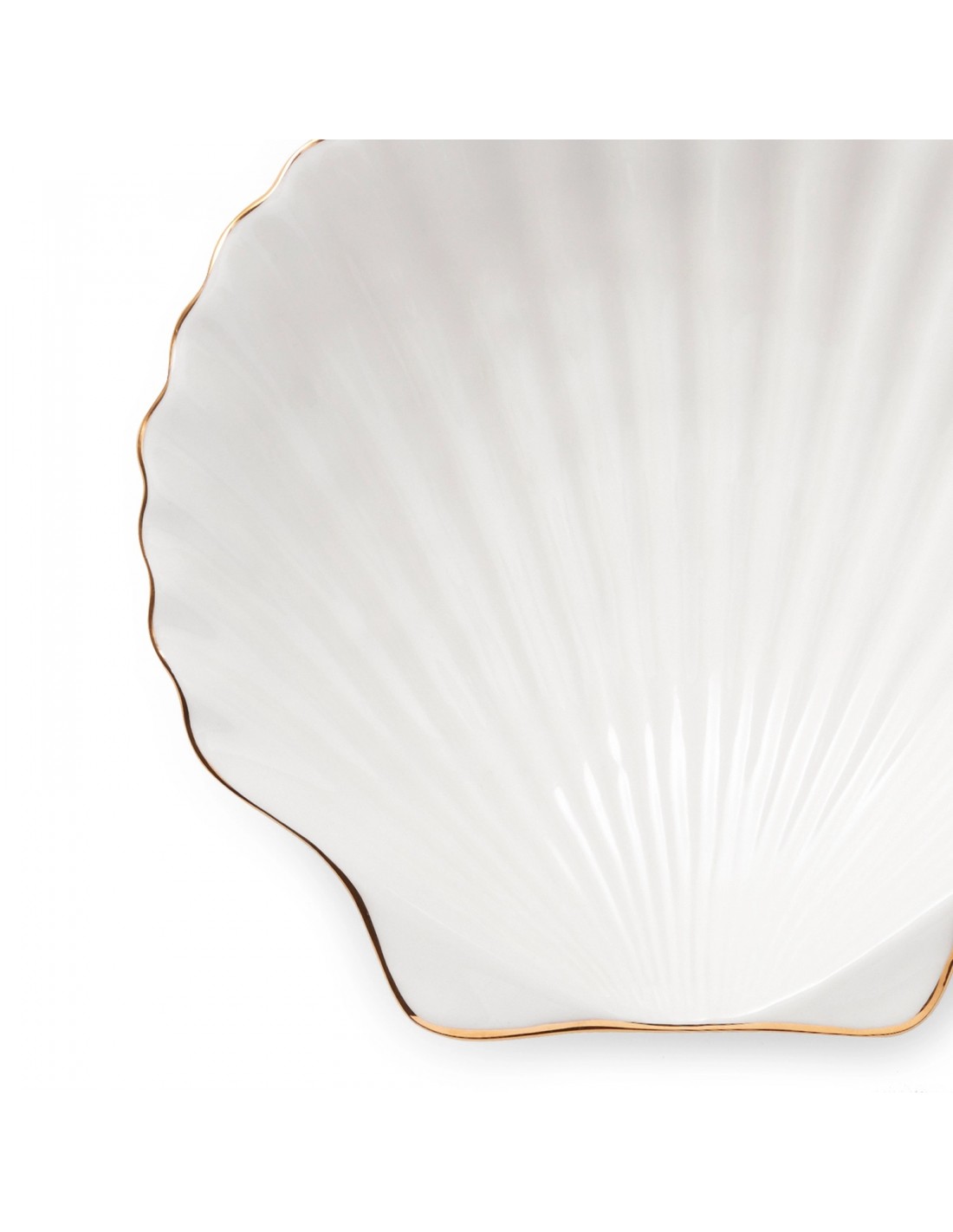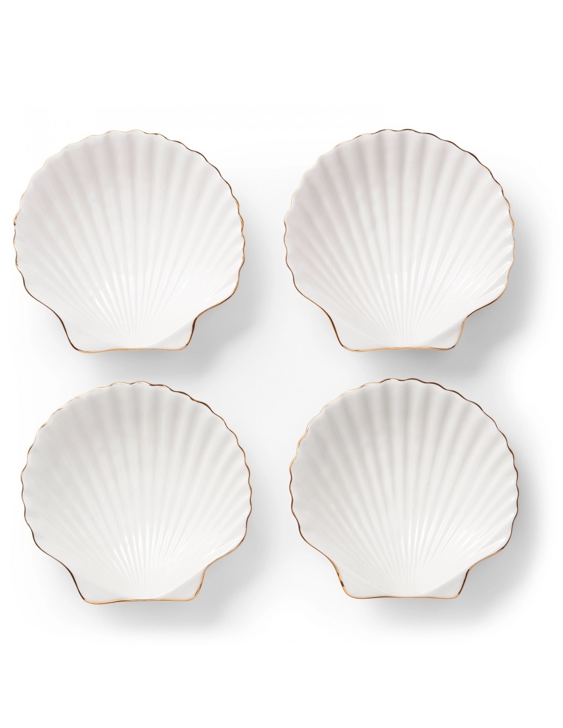 Aporta un toque costero a la mesa con este juego de cuatro platos para aperitivos inspirados en una concha de vieira. Los bordes dorados añaden un toque sofisticado.