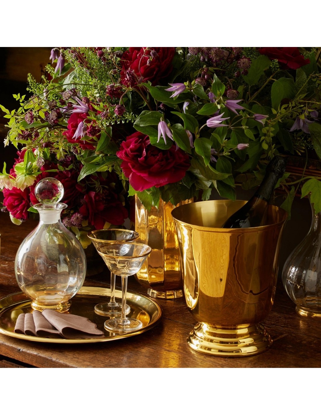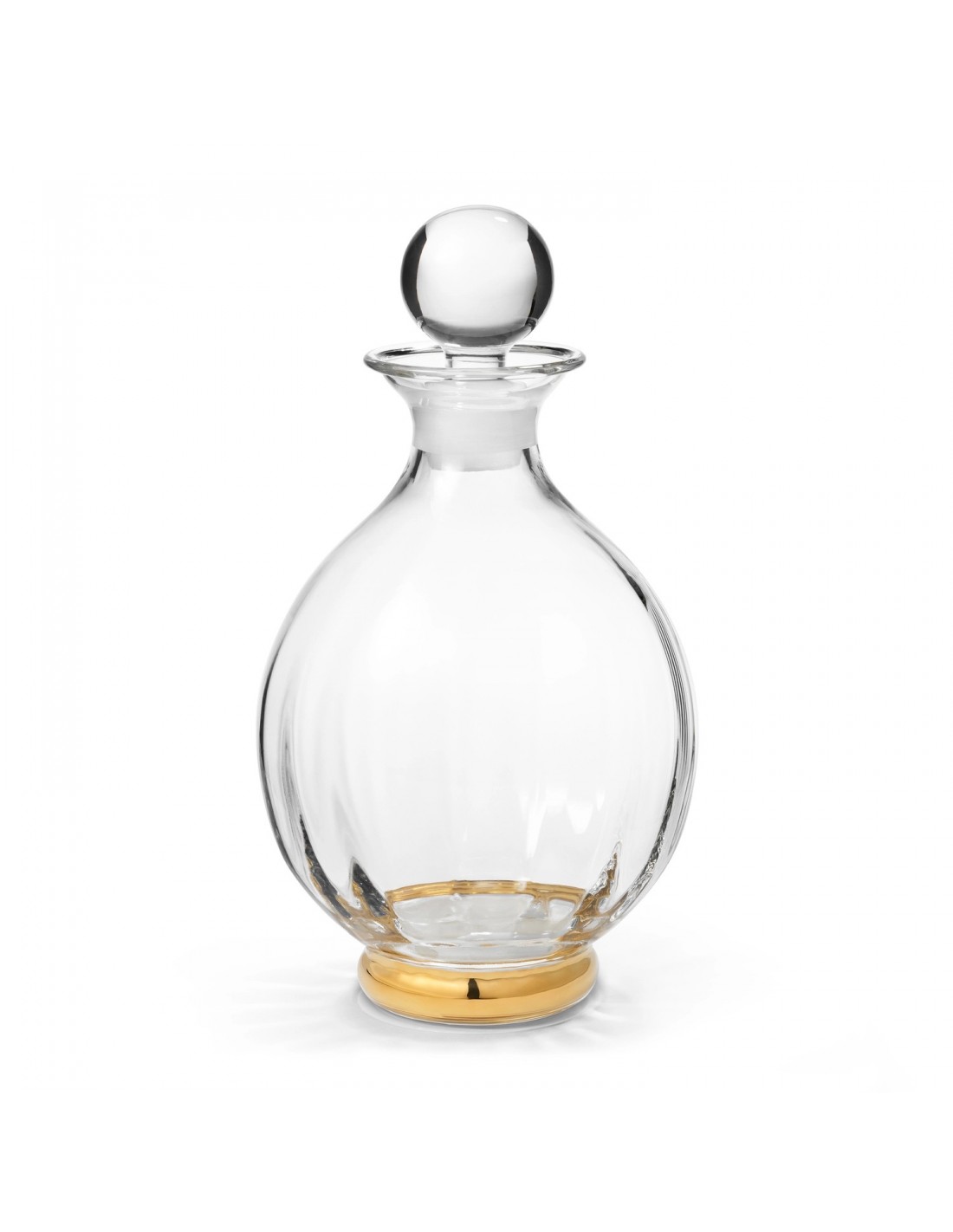 El decantador Sophia está soplado a mano en Italia y realzado con oro pintado a mano en la base. El diseño acanalado y el tapón esférico de cristal macizo le dan un aspecto vintage que añade un toque elegante a la mesa cuando se recibe a invitados.