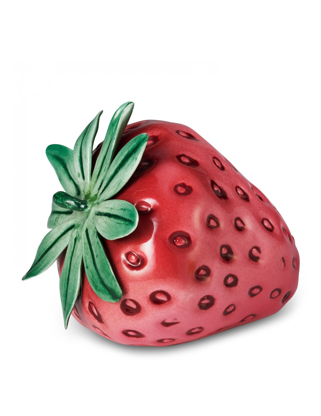 Esta fresa de porcelana esculpida a mano captura el atractivo de una fruta fresca de verano. Pintada meticulosamente por hábiles artesanos en un rojo jugoso con un acabado con semillas y rematada con un tallo y una hoja verdes. El objeto también es de gran tamaño, lo que le suma encanto. Un divertido complemento para un estante de cocina o una mesa.