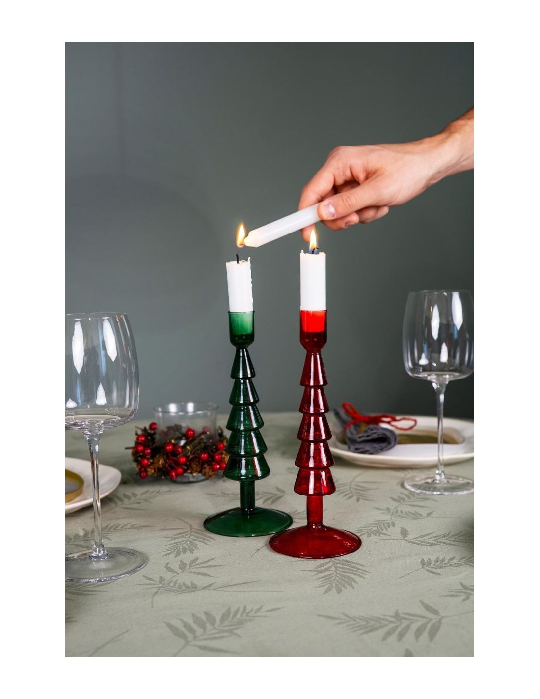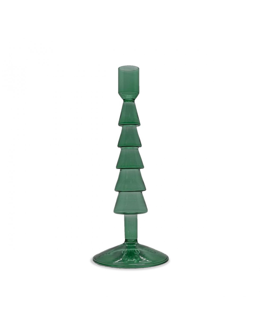 Portavelas de cristal de borosilicato con forma de árbol de Navidad. Un objeto único y colorido, ideal para crear un ambiente cálido y romántico en casa durante las vacaciones.