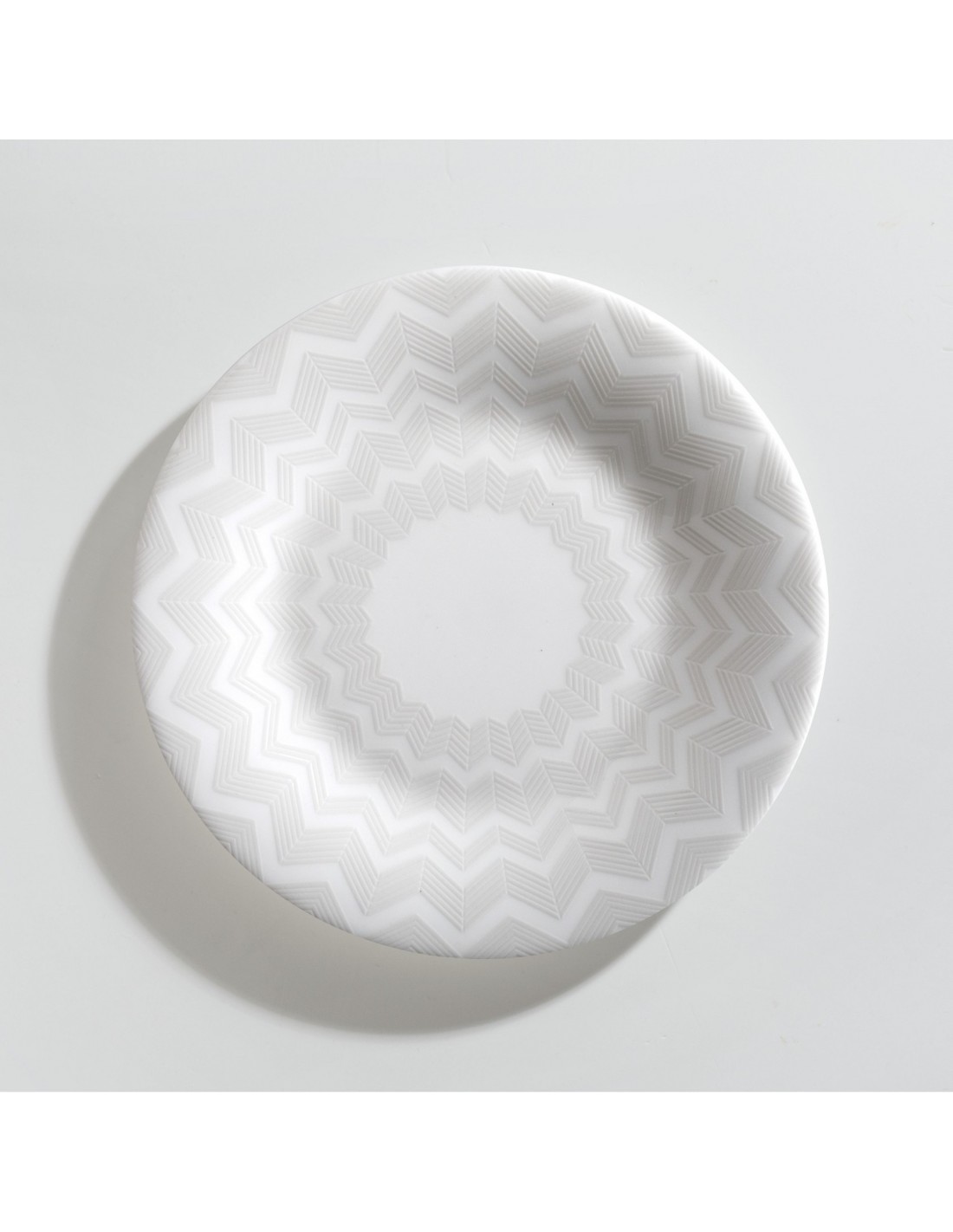 Una hipnótica secuencia de rayas chevron tono sobre tono caracteriza esta colección de porcelana fina. Todos los accesorios de mesa se vuelven icónicos gracias al patrón Zigzag White.
