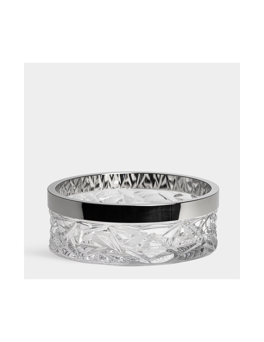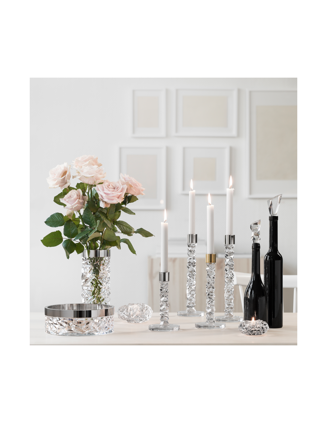 La colección Carat se basa en una interpretación contemporánea del tradicional cristal tallado por el que Orrefors es mundialmente conocido. La geometría irregular produce hermosos reflejos de luz en el cuenco de cristal y ofrece un claro contraste con el borde de metal pulido de la parte superior. Diseñado por Lena Bergström.