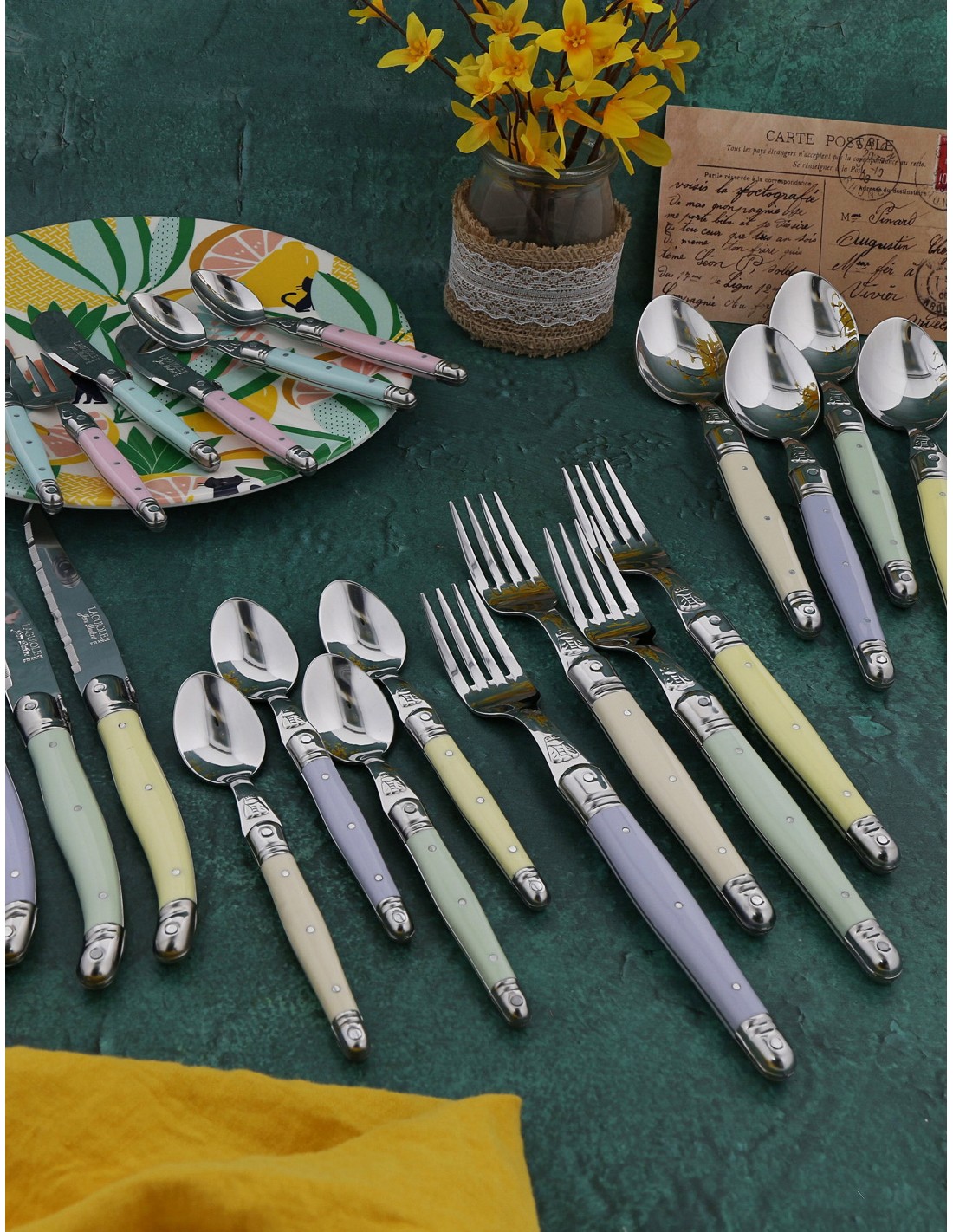 El juego de cuchillos para mantequilla Laguiole de JeanDubost es ideal para servir quesos y otras delicias. Desde hace más de 100 años, Jean Dubost produce cuchillos y cubiertos según las mejores tradiciones de forja, desarrolladas de generación en generación en el corazón de Francia, cerca de THIERS. Para cada pieza, se seleccionan cuidadosamente las mejores materias primas y cada producto se termina con gran precisión.