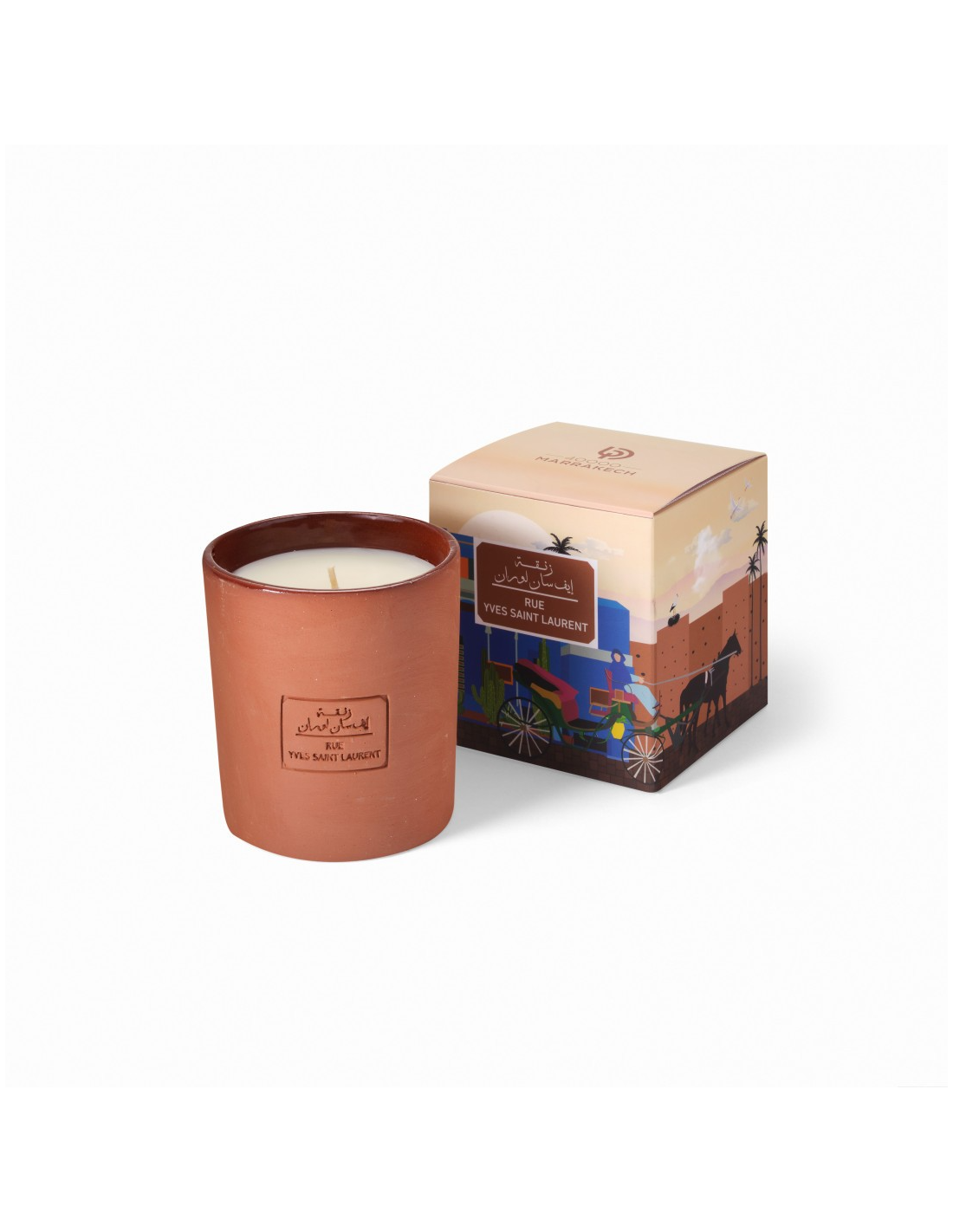 Vela en recipiente de arcilla hecha a mano con el aroma de Rue Yves Saint Laurent, inicialmente, una frescura ácida gracias a una mandarina chispeante contrarrestada por una vainilla gourmet dulce.