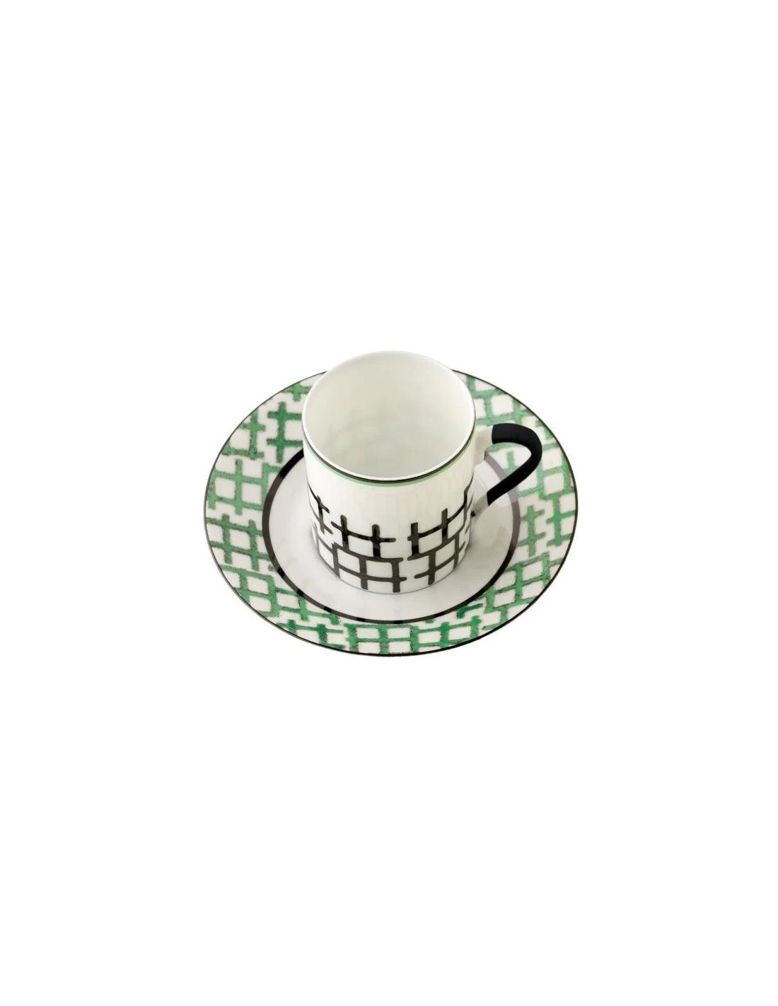 Experimente el diseño moderno y artístico de la taza y platillo de café Menta. Con una combinación de líneas perpendiculares y paralelas y un círculo puro, esta colección evoca campos y movimientos atléticos.