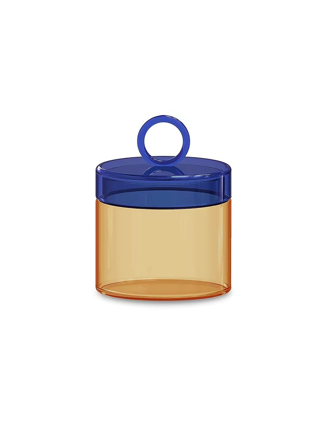 Tarro en vidrio borosilicato con asa anular de color, con capacidad para 500 ml, en color naranja y azul.
