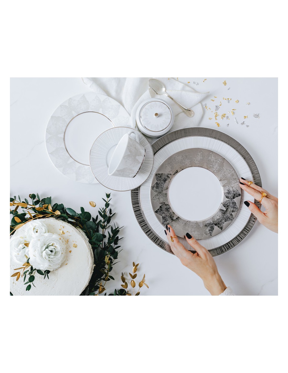 Esta nueva decoración toma su nombre del bosque, una evocación poética de los árboles, maestros del bosque. También es una invitación a echar un vistazo más de cerca a la belleza de la naturaleza: las delicadas venas del follaje y las fibras vegetales actualizadas visten el ala de las placas, alternativamente en blanco sobre blanco en relieve o en platino.