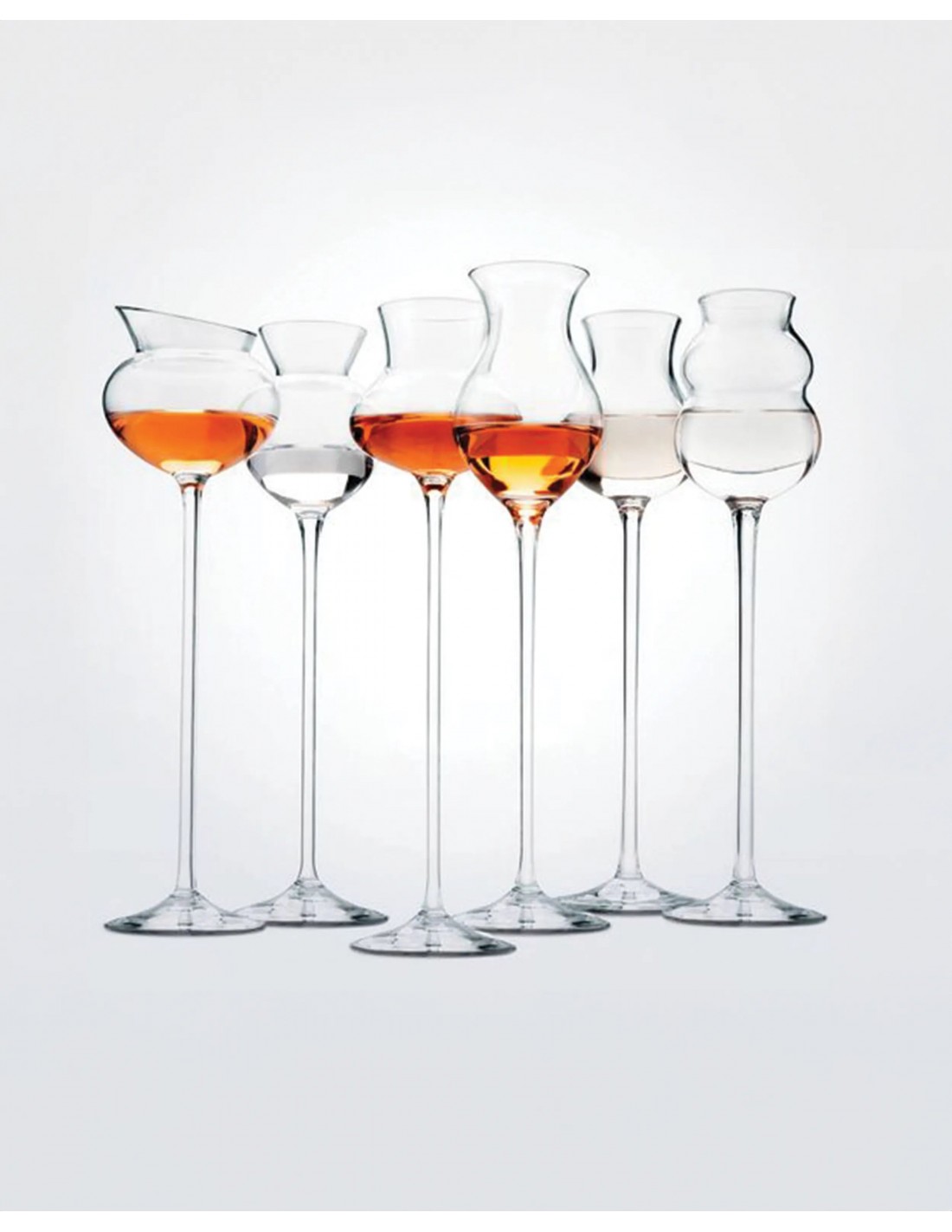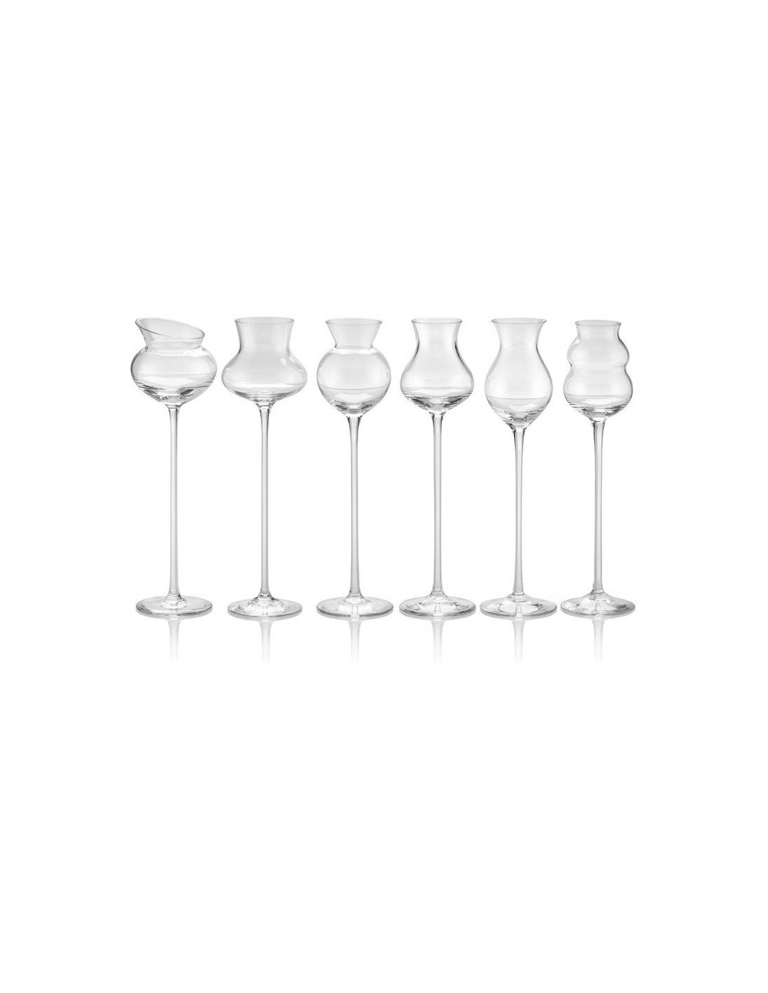 Juego de seis copas de licor variadas en vidrio soplado transparente. Hecho a mano de vidrio soplado transparente de alta calidad, cada vaso está diseñado de forma única con diferentes formas para maximizar el aroma, el sabor y la experiencia sensorial general de varios espíritus. Diseñados con diferentes formas adaptadas para licores específicos como whisky, bourbon, vodka, ron, ginebra y tequila, estos vasos maximizan el perfil de aroma y sabor de cada bebida.