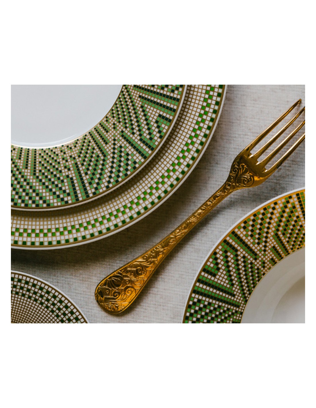 De inspiración Art Déco, un mosaico de oro, verde suave y verde esmeralda se despliega en alfombras y frisos. Durante este período, se vuelve al rigor clásico después de las volutas y las formas orgánicas del Art Nouveau. Los motivos se simplifican, se reducen a figuras influenciadas por la geometrización cubista y las artes antiguas, griegas o romanas. El verde o el amarillo, combinados con el blanco y el negro, son combinaciones de colores particularmente populares. El nombre de la colección Augusta es un guiño al nombre de la ciudad de Limoges, cuna de la porcelana francesa y de la fábrica Bernardaud, bajo el Imperio Romano: Augustoritum.