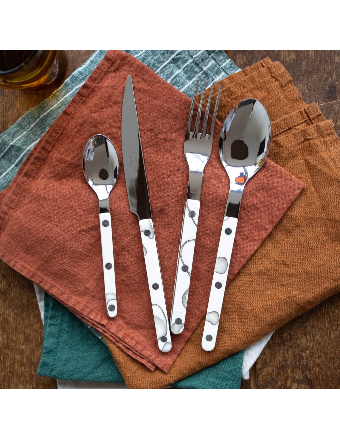 Al diseñar esta cubertería, quisimos capturar fielmente la atmósfera con un toque moderno: el estilo es sencillo, los remaches son visibles y los colores y materiales resaltan con elegancia. Desde el rojo hasta el azul, sin olvidar los magníficos materiales con efectos de cuerno o carey. Disponibles en acabados brillantes o vintage, estamos seguros de que disfrutará de esta colección, diseñada para ser a la vez tradicional y contemporánea.