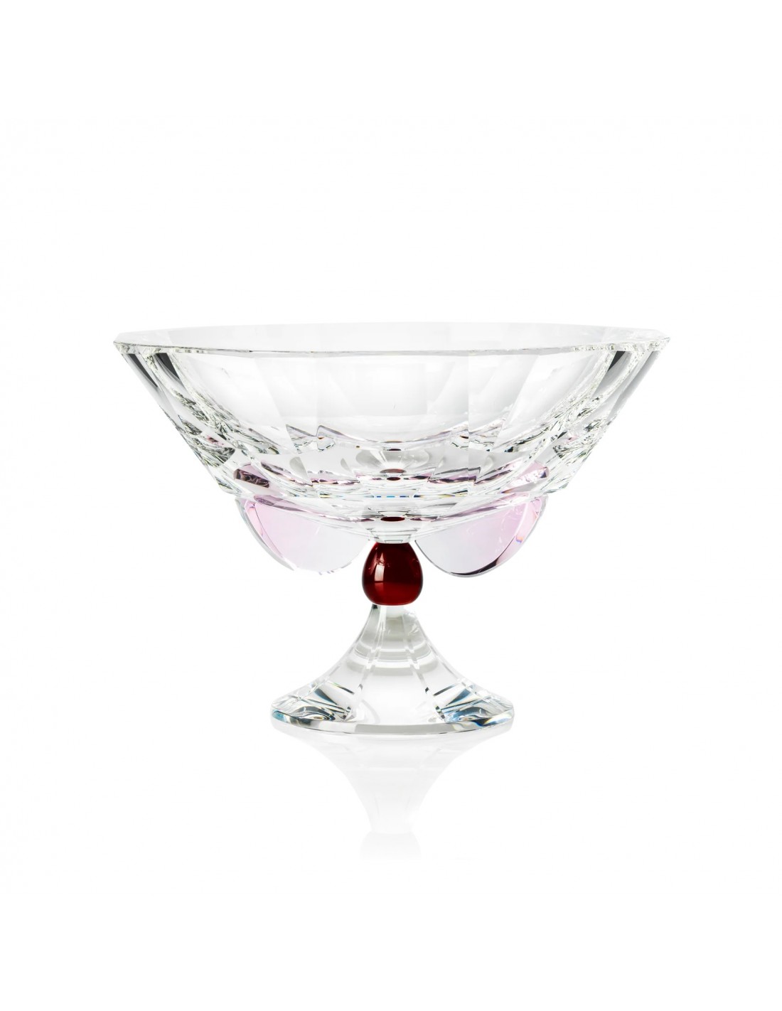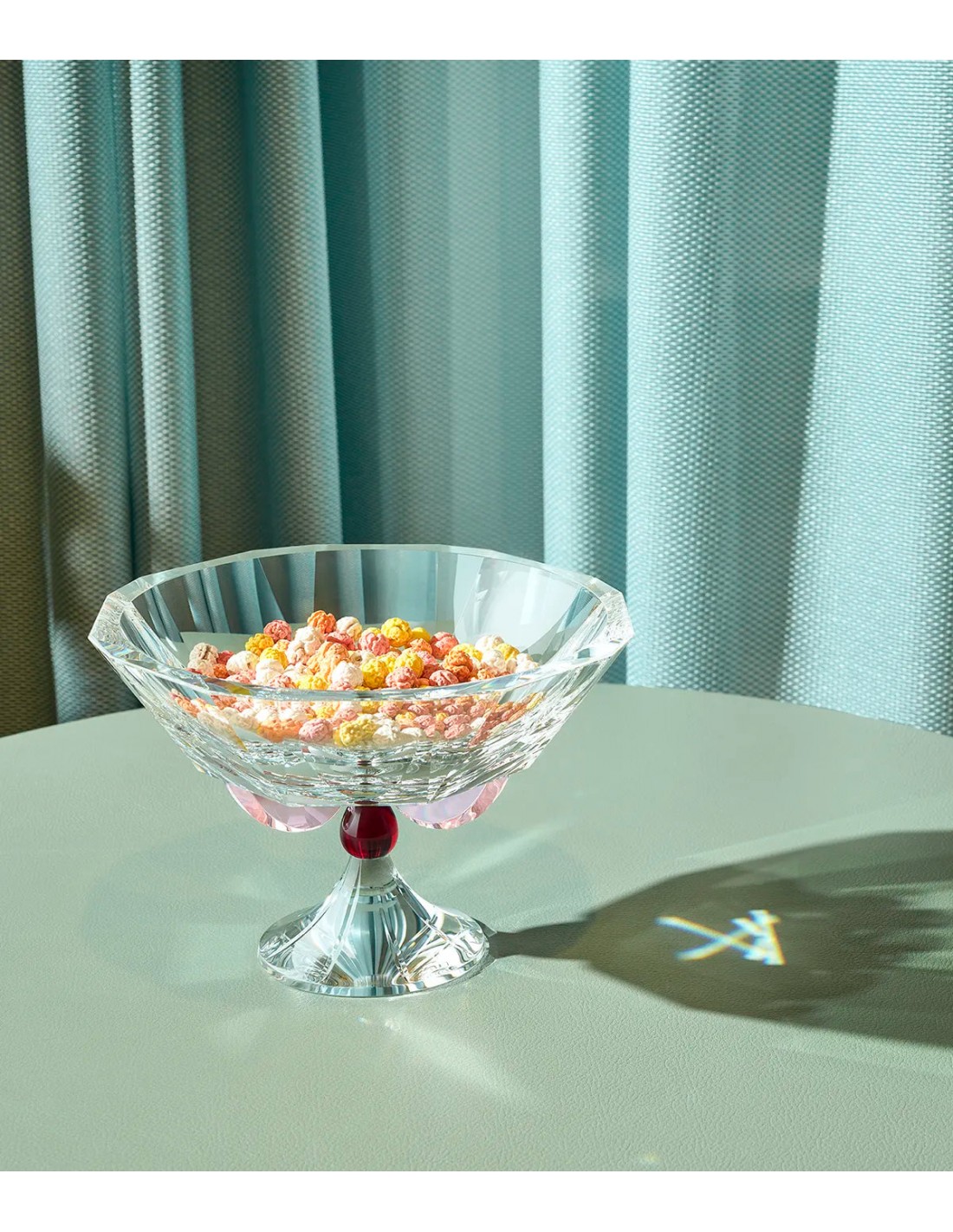 El cuenco Amira es un juego poético de formas y luz. Un cuenco transparente y facetado reposa sobre una base redondeada, unida por un escultural óvalo de cristal rojo. Dos medialunas de cristal rosa elevan el cuenco con discreta elegancia, dándole una sensación de ligereza. Al incidir la luz sobre sus superficies, se despliegan reflejos radiantes. Ideal como pieza destacada o para presentar frutas y dulces con sofisticación.