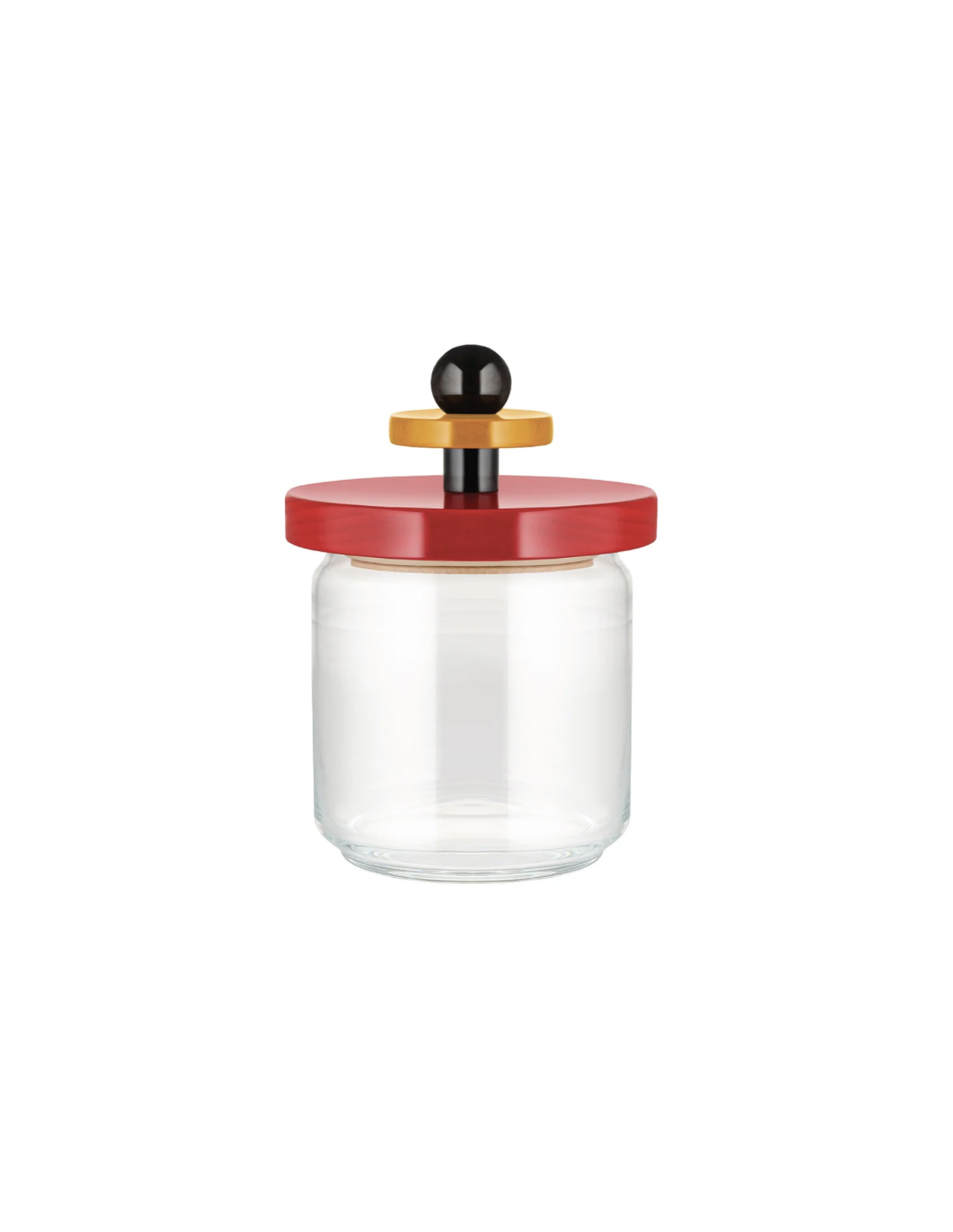 Ettore Sottsass reinterpreta un clásico de la cocina con su inconfundible lenguaje de volúmenes coloreados superpuestos. El bote ideal para conservar alimentos secos como arroz, pasta, galletas, o bien en polvo como azúcar, sal y café. El cuerpo de vidrio y el cierre hermético conservan el sabor y el aroma de los productos.