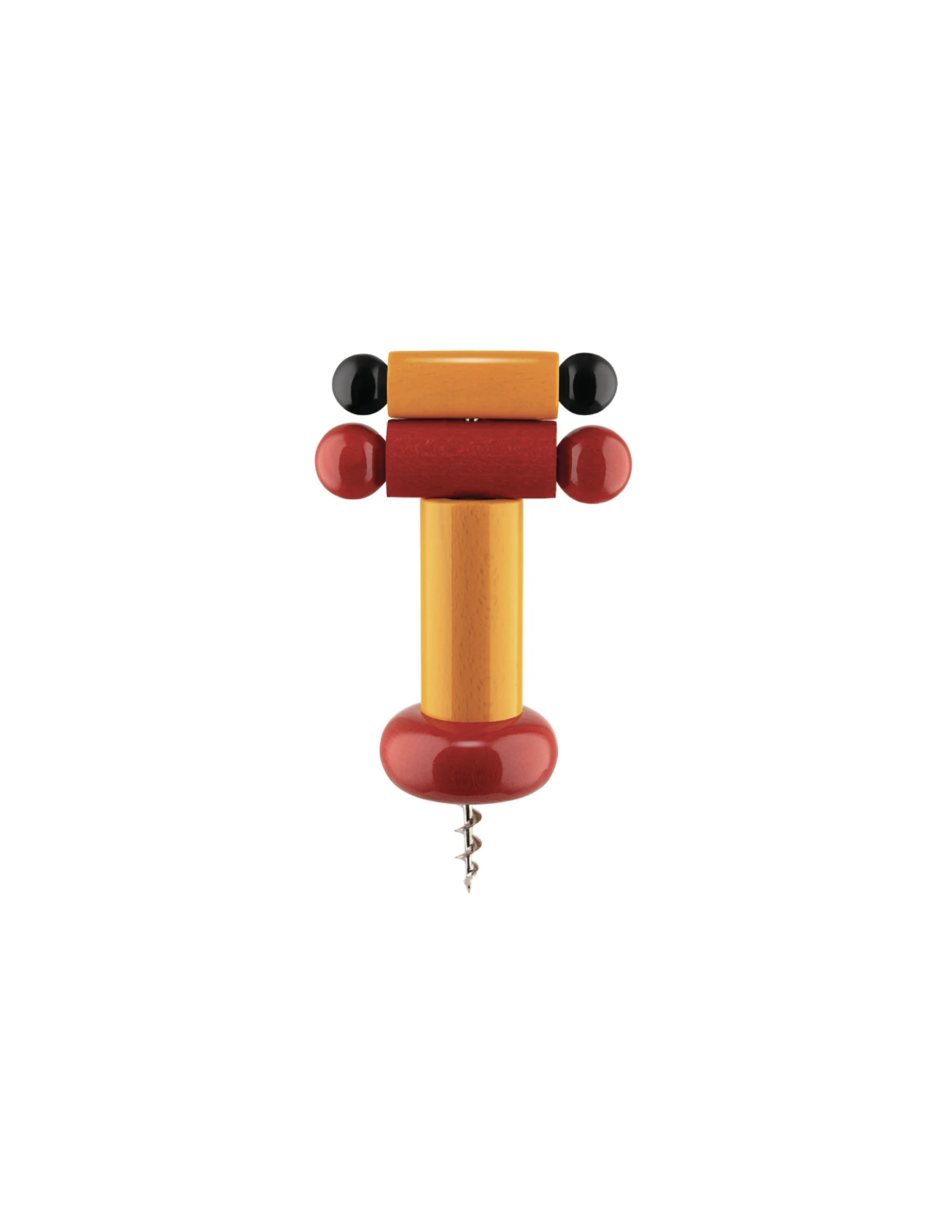 El sacacorchos según Ettore Sottsass: un utensilio funcional y al mismo tiempo emocionante. Fácil de utilizar: los volúmenes diseñados revelan una forma ergonómica, cómoda de agarrar. Fabricado en Italia, en el territorio donde se asienta Alessi, mediante un proceso de torneado semi-artesanal, con maderas de procedencia ecosostenible, y pintado con barnices a base de agua, totalmente libres de disolventes.