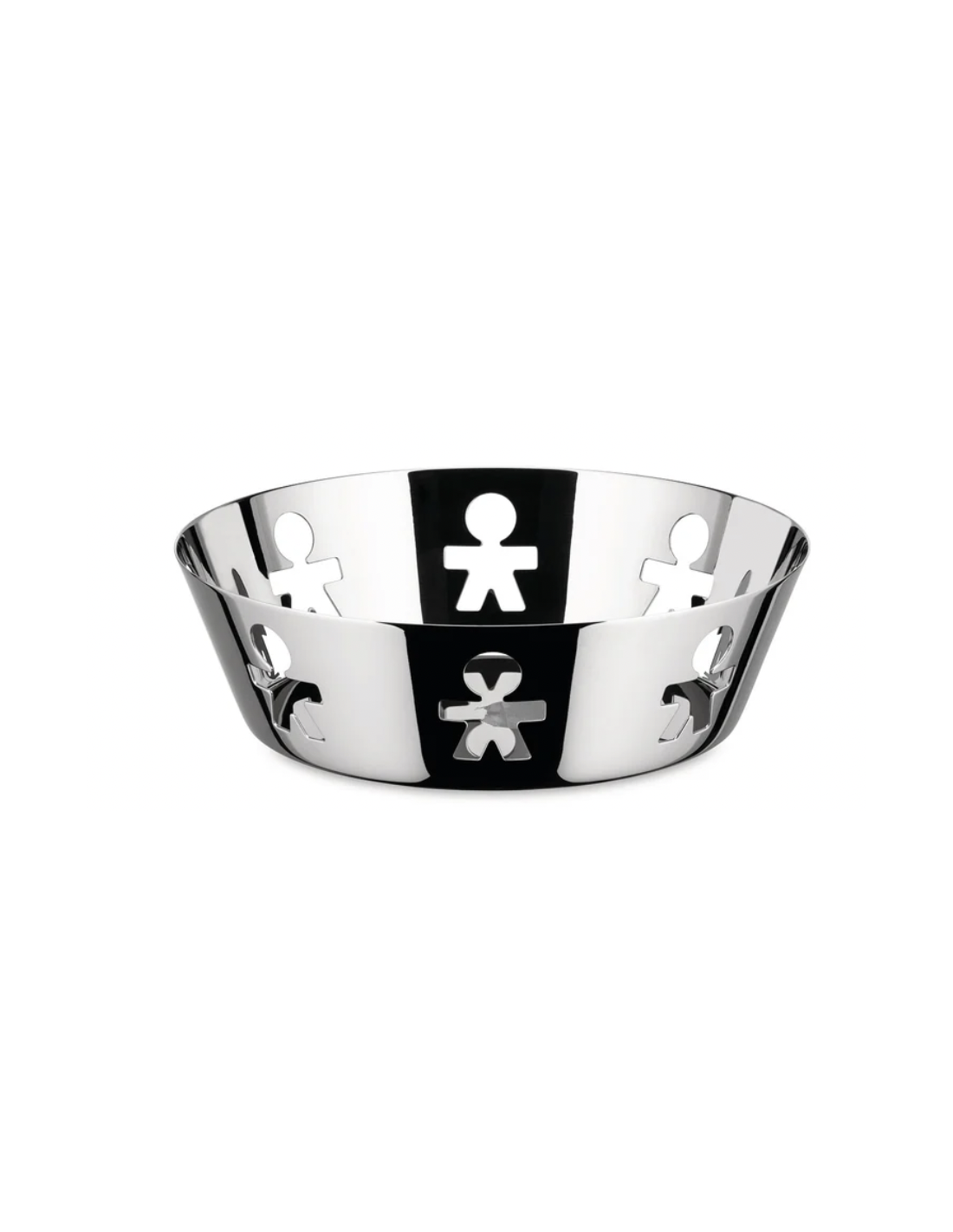 El motivo de muñecas de papel recortadas creado por el dúo de diseñadores Stefano Giovannoni y Guido Venturini, conocidos bajo el nombre de King-Kong, adorna una variedad de objetos cotidianos como la canasta de acero inoxidable Girotondo.